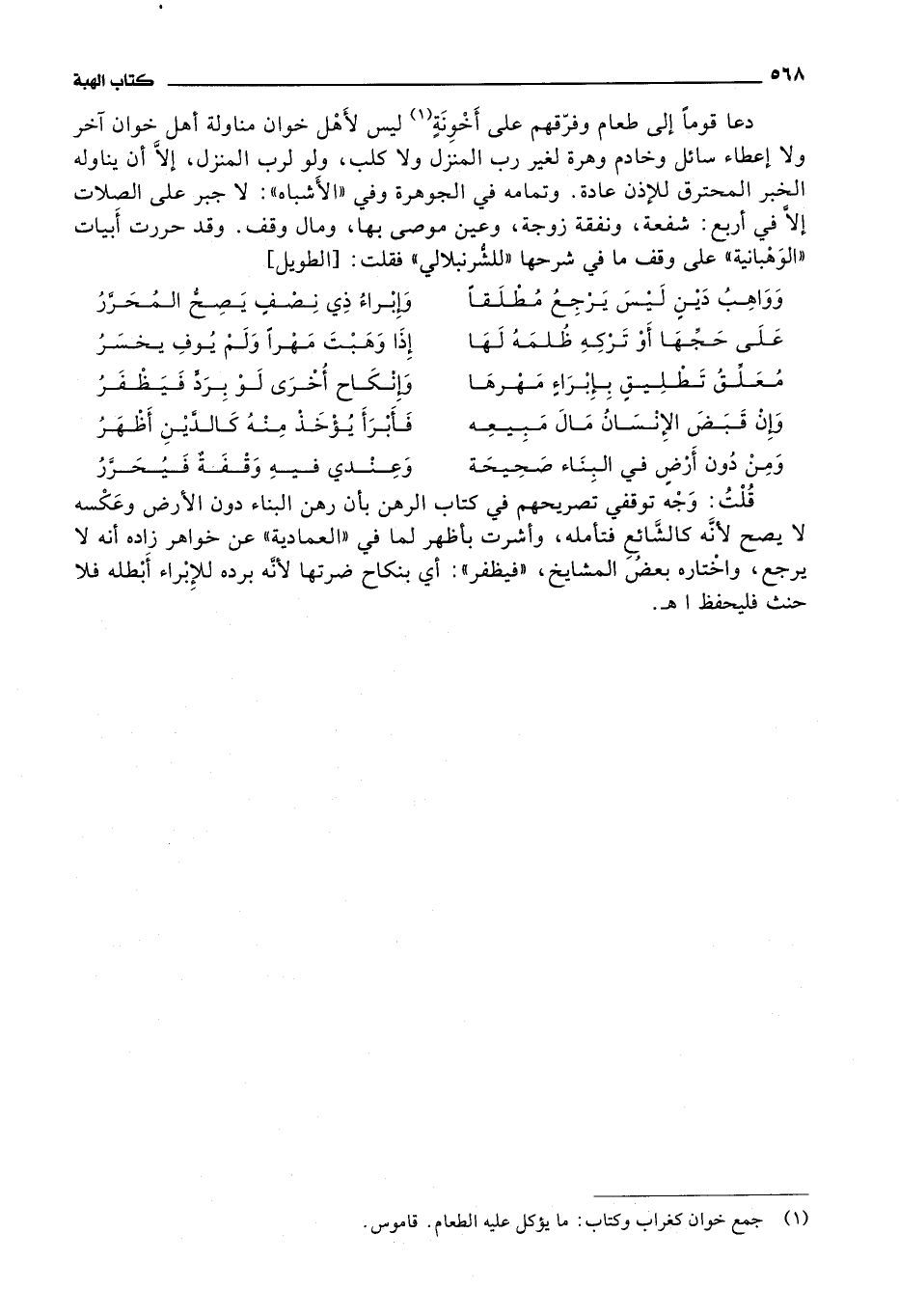 وقد حررت أبيات الوهبانية على وقف ما في شرحها للشرنبلالي فقلت: وواهب دين ليس يرجع مطلقا * * وإبراء ذي نصف يصح المحرر على حجها أو تركه ظلمه لها * * إذا وهبت مهرا ولم يوف يخسر معلق تطليق بإبراء مهرها * * وإنكاح أخرى لو برد فيظفر وإن قبض الانسان مال مبيعه * * فأبرأ يؤخذ منه كالدين أظهر ومن دون أرض في البناء صحيحة * * وعندي فيه وقفة فيحرر قلت: وجه توقفي تصريحهم في كتاب الرهن بأن رهن البناء دون الارض وعكسه لا يصح لانه كالشائع فتأمله، وأشرت بأظهر لما في العمادية عن خواهر زاده أنه لا يرجع، واختاره