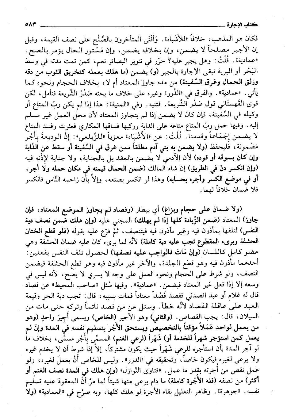 قلت: وهل يجبر عليه؟ حرر في تنوير البصائر نعم، كمن تمت مدته في وسط البحر أو البرية تبقى الاجارة بالجبر (و) يضمن (ما هلك بعمله كتخريق الثوب من دقه وزلق الحمال وغرق السفينة) من مده جاوز المعتاد أم لا، بخلاف الحجام