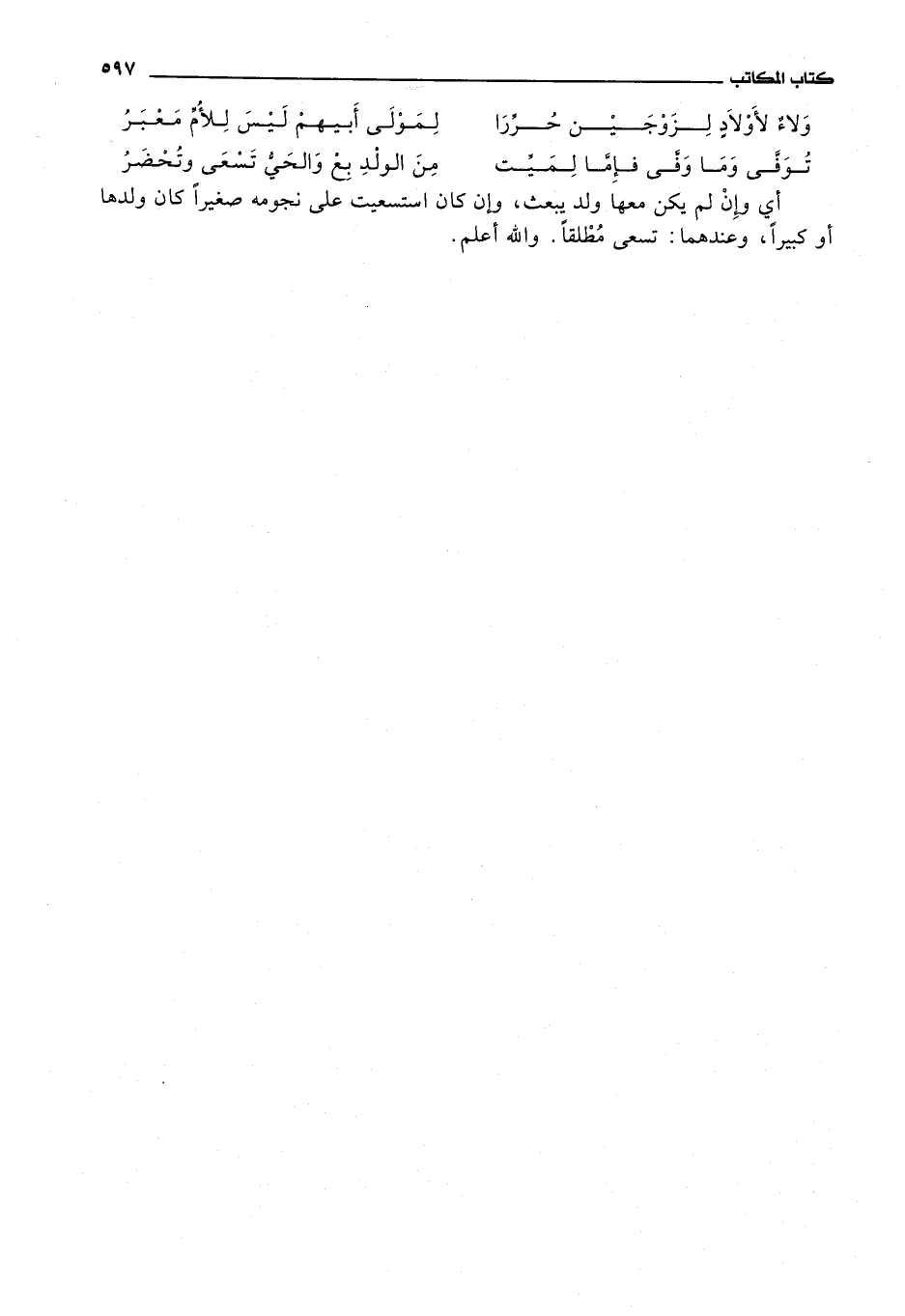 ولاء لاولاد لزوجين حررا * لمولى أبيهم ليس للام معبر توفى وما وفى فإما لميت * من الولد بع والحي تسعى وتخضر أي وإن لم يكن معها ولد يبعث، وإن كان استسعيت على نجومه صغيرا كان ولدها أو كبيرا، وعندهما: تسعى مطلقا.