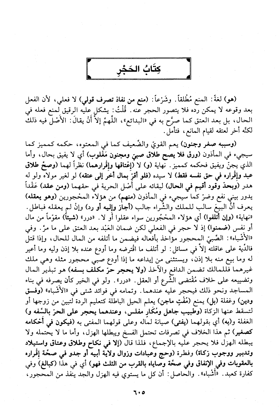 لماله وعلى قولهما المفتى به (فيكون في أحكامه كصغير) ثم هذا الخلاف في تصرفات تحتمل الفسخ ويبطلها الهزل، وأما ما لا يحتمله ولا يبطله الهزل فلا يحجر عليه بالاجماع، فلذا قال (إلا في نكاح وطلاق وعتاق واستيلاد وتدبير ووجوب زكاة) وفطرة (وحج
