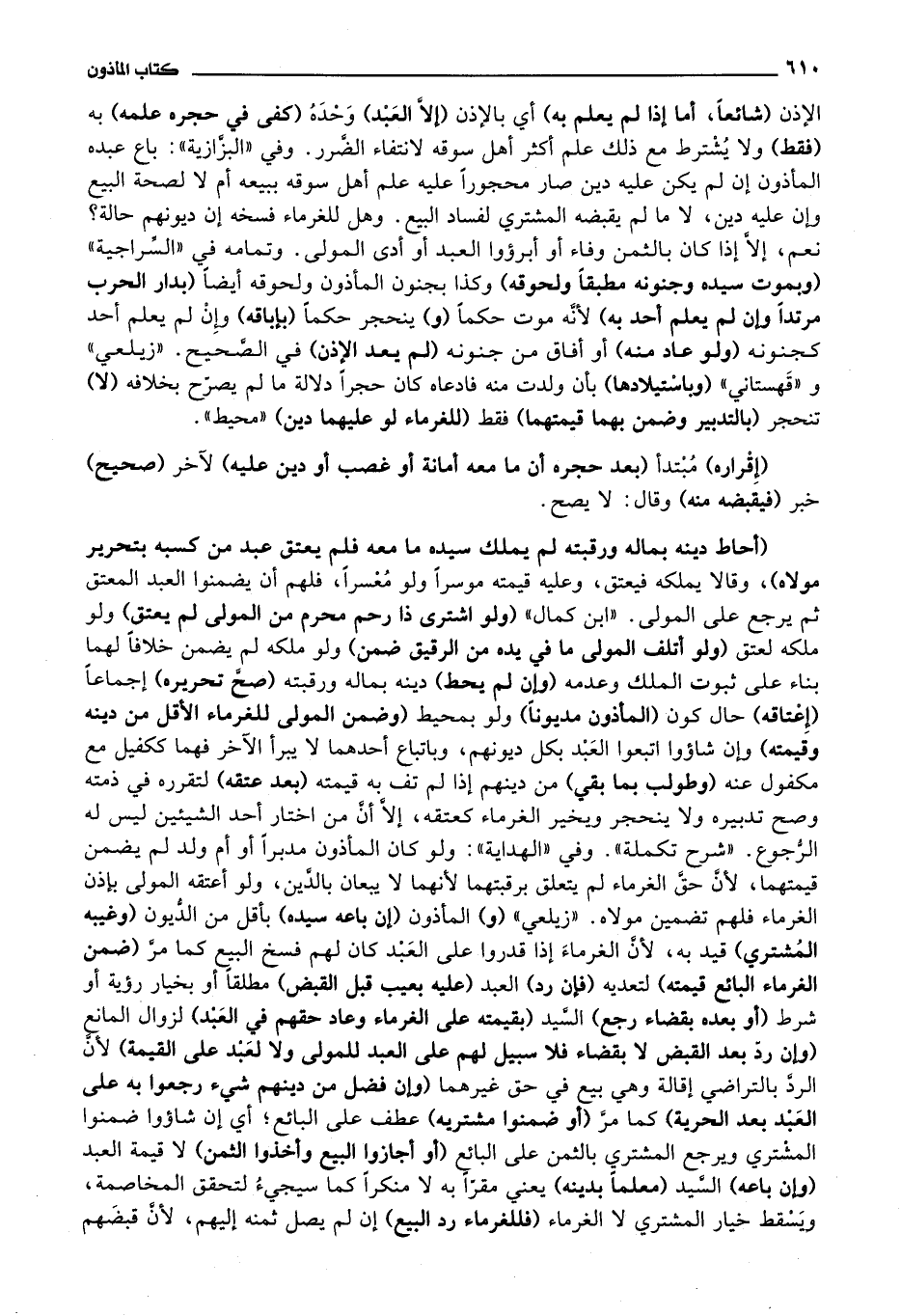 وفي البزازية: باع عبده المأذون إن لم يكن عليه دين صار محجورا عليه علم أهل سوقه ببيعه أم لا لصحة البيع وإن عليه دين، لا ما لم يقبضه المشتري لفساد البيع.