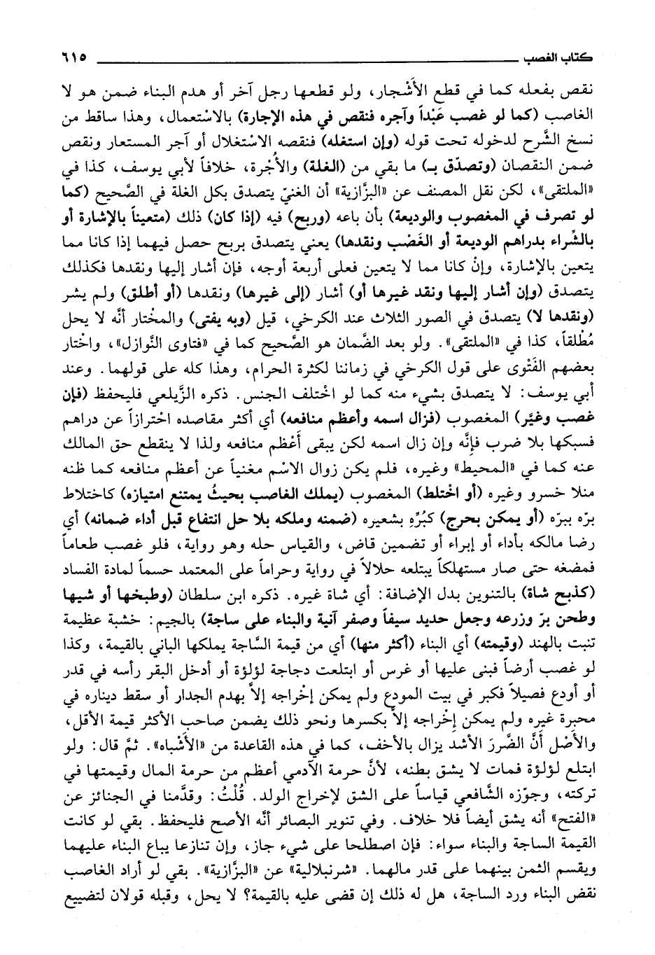 (وطبخها أو شيها وطحن بر وزرعه وجعل حديد سيفا وصفر آنية والبناء على ساجة) بالجيم: خشبة عظيمة تنبت بالهند (وقيمته) أي البناء (أكثر منها) أي من قيمة الساجة يملكها الباني بالقيمة، وكذا لو غصب أرضا فبنى عليها أو غرس أو ابتلعت دجاجة لؤلؤة أو أدخل البقر رأسه في قدر أو أودع فصيلا فكبر في بيت المودع ولم يمكن إخراجه إلا بهدم الجدار أو سقط ديناره في محبرة غيره ولم يمكن إخراجه إلا بكسرها ونحو ذلك يضمن صاحب الاكثر قيمة الاقل، والاصل أن الضرر الاشد يزال بالاخف، كما في هذه القاعدة من الاشباه.