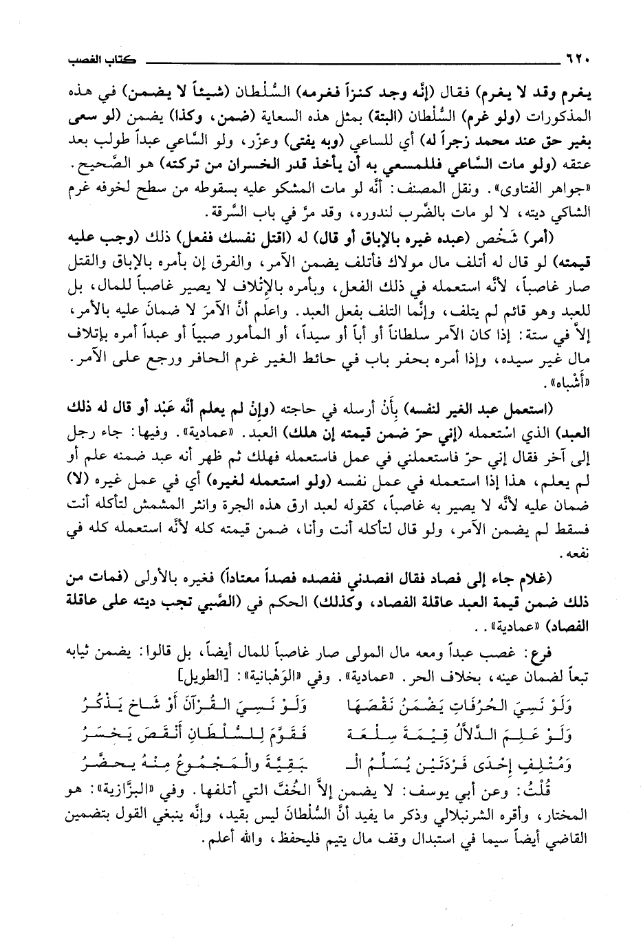 إذا استعمله في عمل نفسه (ولو استعمله لغيره) أي في عمل غيره (لا) ضمان عليه لانه لا يصير به غاصبا، كقوله لعبد ارق هذه الجرة وانثر المشمش لتأكله أنت فسقط لم يضمن الآمر، ولو قال لتأكله أنت وأنا، ضمن قيمته كله لانه استعمله كله في نفعه.
