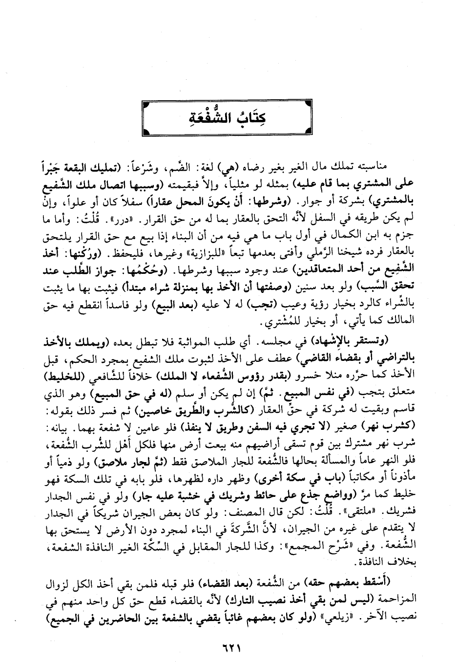 مناسبته تملك مال الغير بغير رضاه (هي) لغة: الضم، وشرعا: (تمليك البقعة جبرا على المشتري بما قام عليه) بمثله لو مثليا، وإلا فبقيمته (وسببها اتصال ملك الشفيع بالمشتري) بشركة