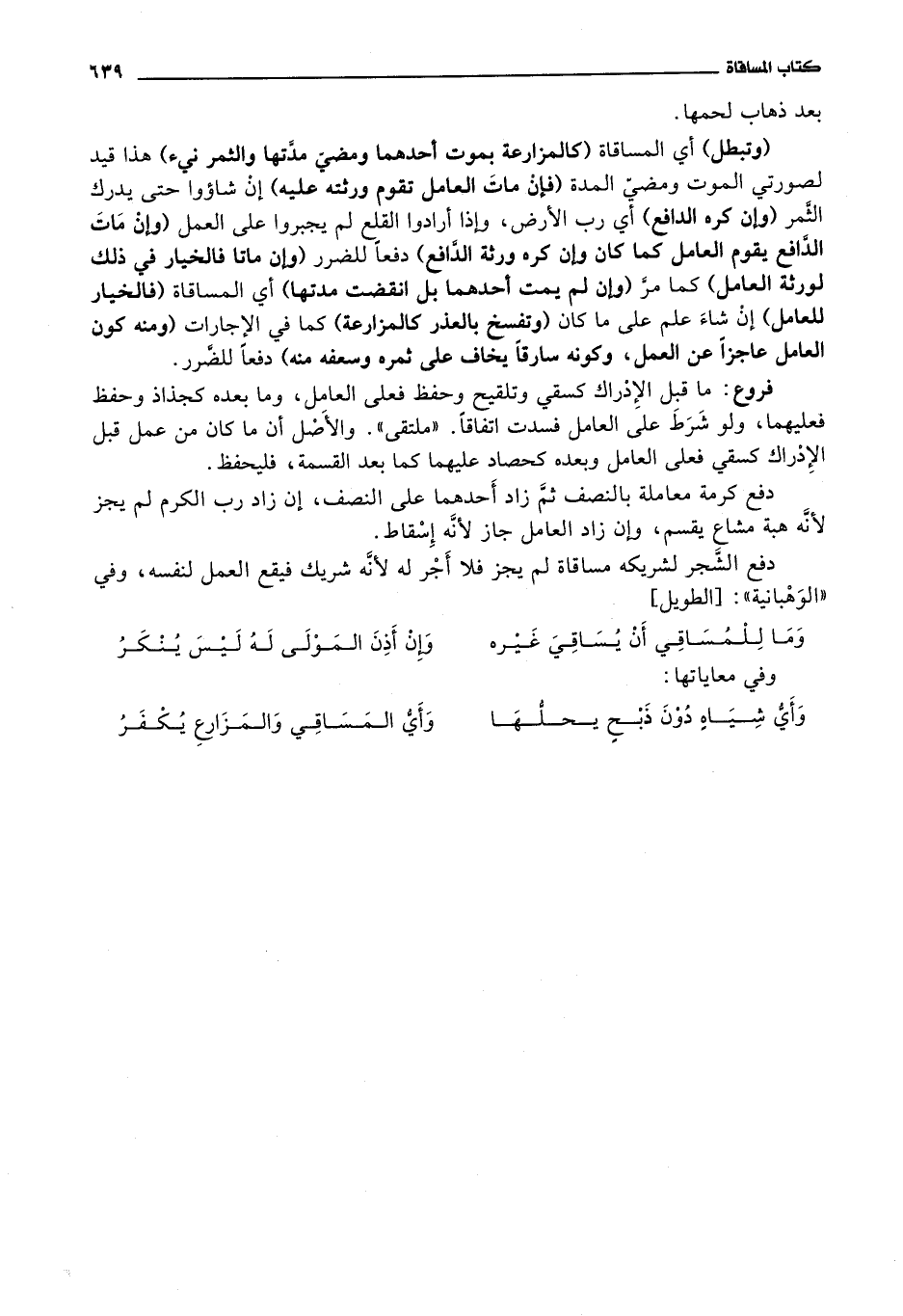 (وتبطل) أي المساقاة (كالمزارعة بموت أحدهما ومضي مدتها والثمر نئ) هذا قيد لصورتي الموت ومضي المدة (فإن مات العامل تقوم ورثته عليه) إن شاؤوا حتى يدرك الثمر (وإن كره الدافع) أي رب الارض، وإذا أرادوا القلع لم يجبروا على العمل (وإن مات الدافع يقوم العامل