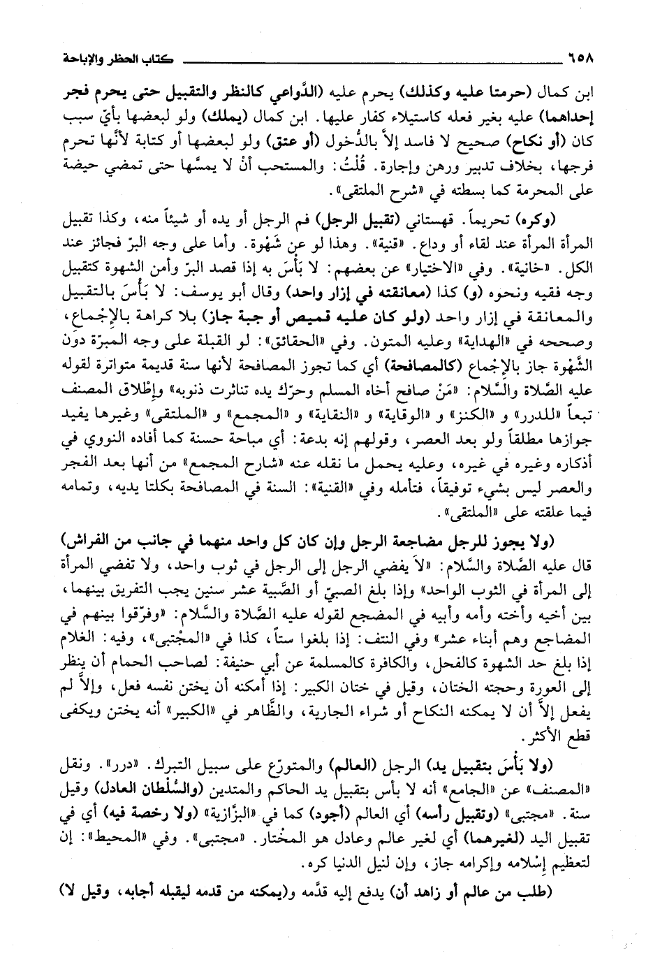 وفي الحقائق: لو القبلة على وجه المبرة دون الشهوة جاز بالاجماع (كالمصافحة) أي كما تجوز المصافحة لانها سنة قديمة متواترة لقوله عليه الصلاة والسلام: من صافح أخاه المسلم وحرك يده تناثرت ذنوبه وإطلاق المصنف تبعا للدرر والكنز والوقاية والنقاية والمجمع والملتقى وغيرها يفيد جوازها مطلقا ولو بعد العصر، وقولهم إنه بدعة: أي مباحة حسنة كما أفاده النووي في أذكاره وغيره في غيره، وعليه يحمل ما نقله عنه شارح المجمع من أنها بعد الفجر والعصر ليس بشئ توفيقا، فتأمله وفي القنية: السنة في المصافحة بكلتا يديه،