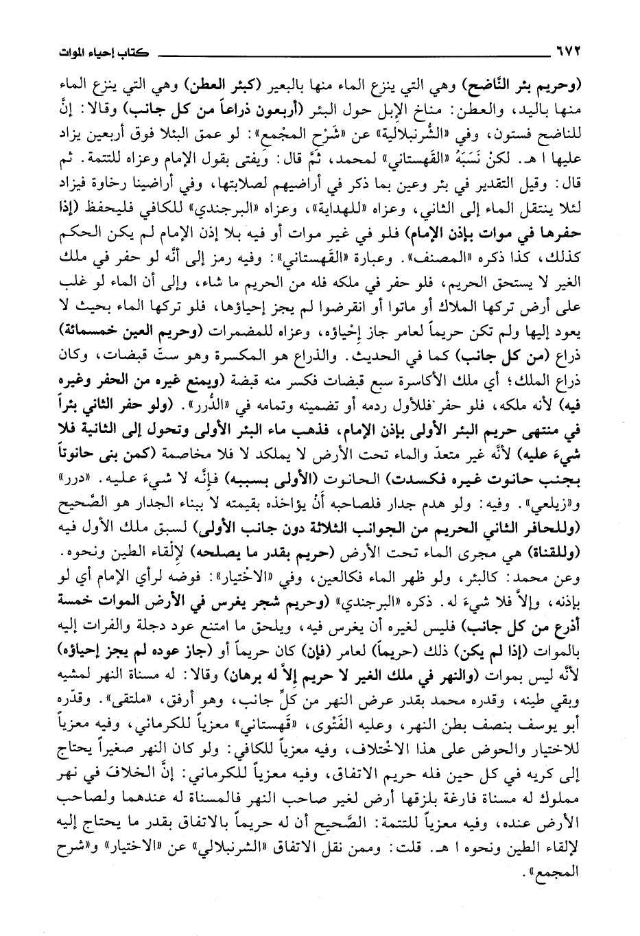 (وحريم بئر الناضح) وهي التي ينزع الماء منها بالبعير (كبئر العطن) وهي التي ينزع الماء منها باليد، والعطن: مناخ الابل حول البئر (أربعون ذراعا من كل جانب) وقالا: إن للناضح فستون، وفي الشرنبلالية عن شرح المجمع: لو عمق البئلا فوق أربعين يزاد عليها اهـ.