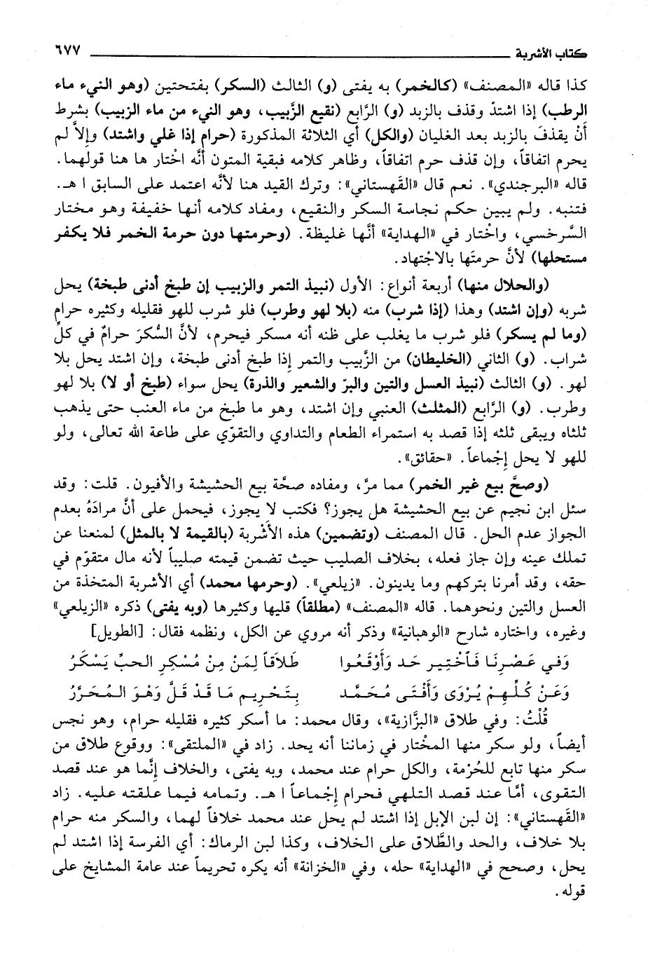 وذكر أنه مروي عن الكل، نظمه فقال: وفي عصرنا فاختير حد وأوقعوا طلاقا لمن من مسكر الحب يسكر وعن كلهم يروى وأفتى محمد بتحريم ما قد قل وهو المحرر قلت: وفي طلاق البزازية، وقال محمد: ما أسكر كثيره فقليله حرام، وهو نجس أيضا، ولو سكر منها المختار في زماننا أنه يحد.