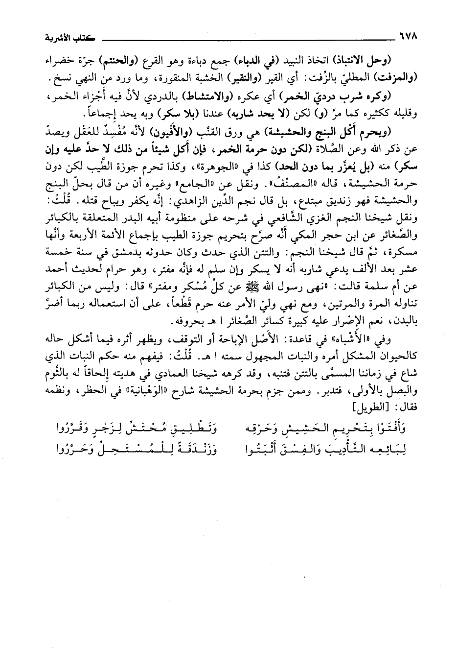 وممن جزم بحرمة الحشيشة شارح الوهبانية في الحظر، ونظمه فقال: وأفتوا بتحريم الحشيش وحرقه وتطليق محتش لزجر وقرروا لبائعه التأديب والفسق أثبتوا وزندقة للمستحل وحرروا