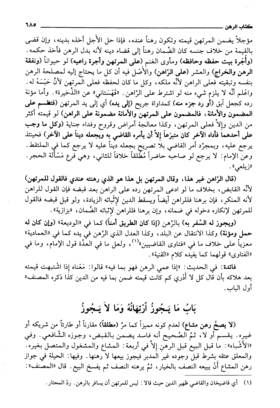 وفيها: الحيلة في جواز رهن المشاع أن يبيعه النصف بالخيار، ثم يرهنه النصف ثم يفسخ البيع.