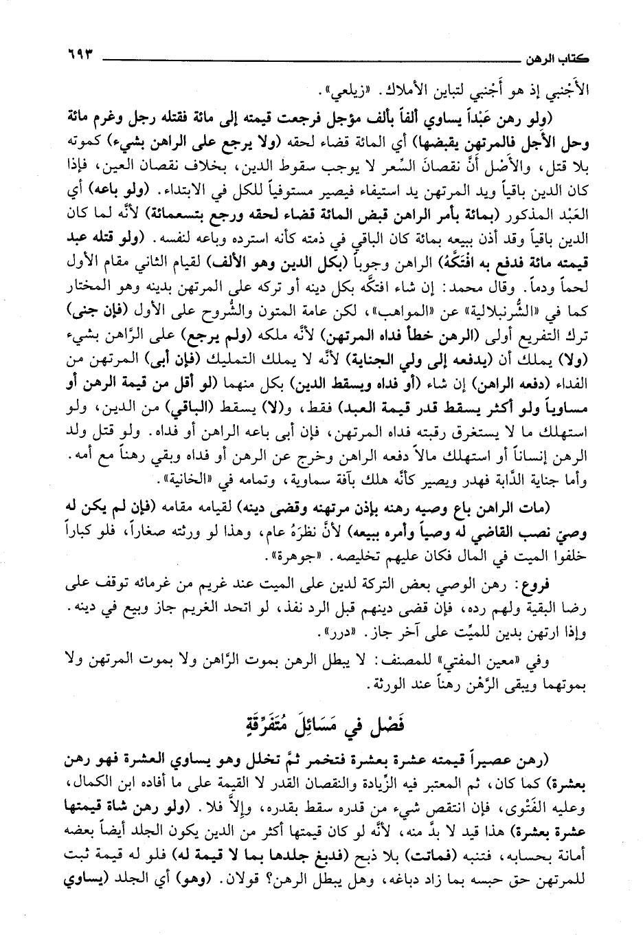 فصل في مسائل متفرقة (رهن عصيرا قيمته عشر بعشرة فتخمر ثم تخلل وهو يساوي العشرة فهو رهن بعشرة) كما كان، ثمص المعتبر فيه الزيادة والنقصان القدر لا القيمة على ما أفاده ابن الكمال، وعليه الفتوى، فإن انتقص شئ من قدره سقط بقدره، وإلا فلا.
