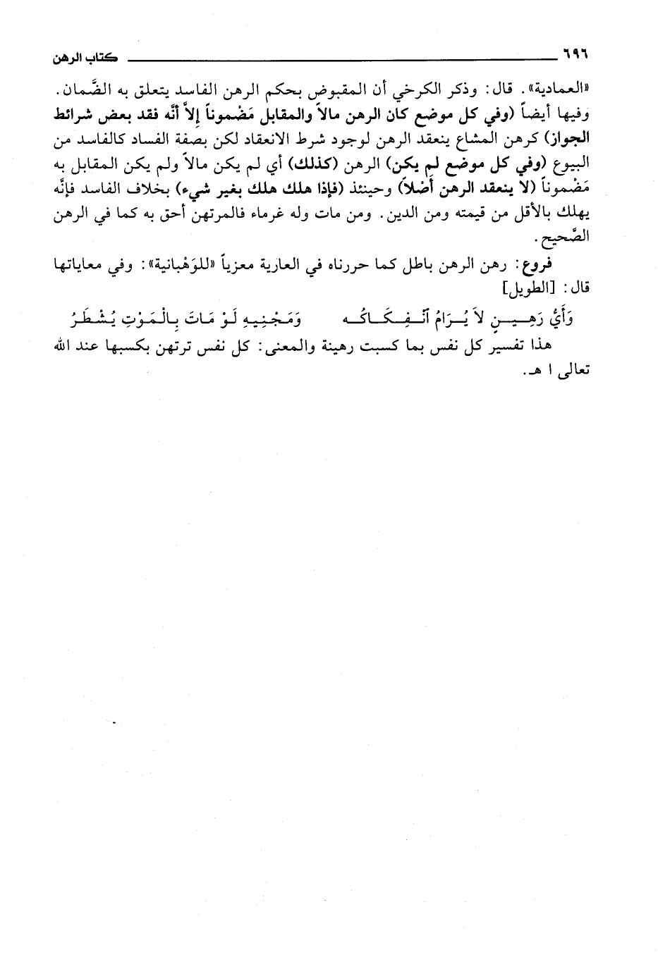 فروع: رهن الرهن باطل كما حررناه في العارية معزيا للوهبانية: وفي معاياتها قال: وأي رهين يرام انفكاكه ومجنيه لو مات بالموت يشطر هذا تفسير كل نفس بما كسبت رهين والمعنى: كا نفس ترتهن بكسبها عند الله تعالى اهـ.