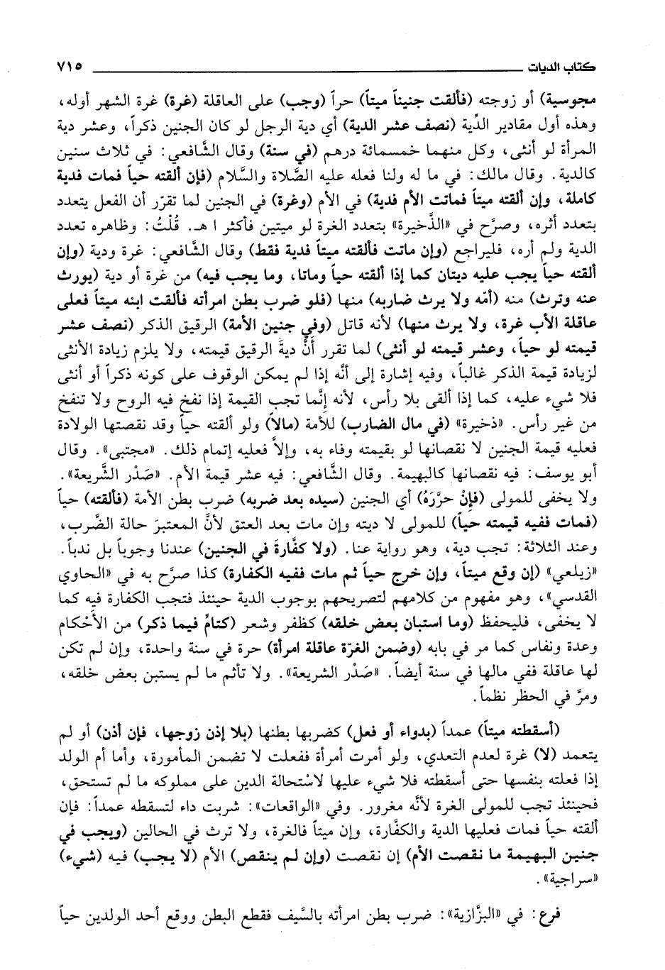مجوسية) أو زوجته (فألقت جنينا ميتا) حرا (وجب) على العاقلة (غرة) غرة الشهر أوله وهذه أول مقادير الدية (نصف عشر الدية) أي دية الرجل لو كان الجنين ذكرا، وعشر دية المرأة لو أنثى، وكل منهما خمسمائة درهم (في سنة) وقال الشافعي: في ثلاث سنين كالدية.