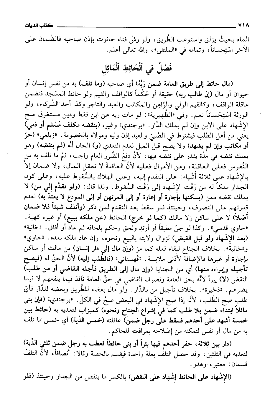 (مال حائط إلى طريق العامة ضمن ربه) أي صاحبه (وما تلف) به من نفس إنسان أو حيوان أو مال (أن طالب ربه) حقيقة أحكما كالواقف والقيم ولو حائط المسجد فتضمن عاقلة الواقف، وكالقيم الولي والراهن والمكاتب