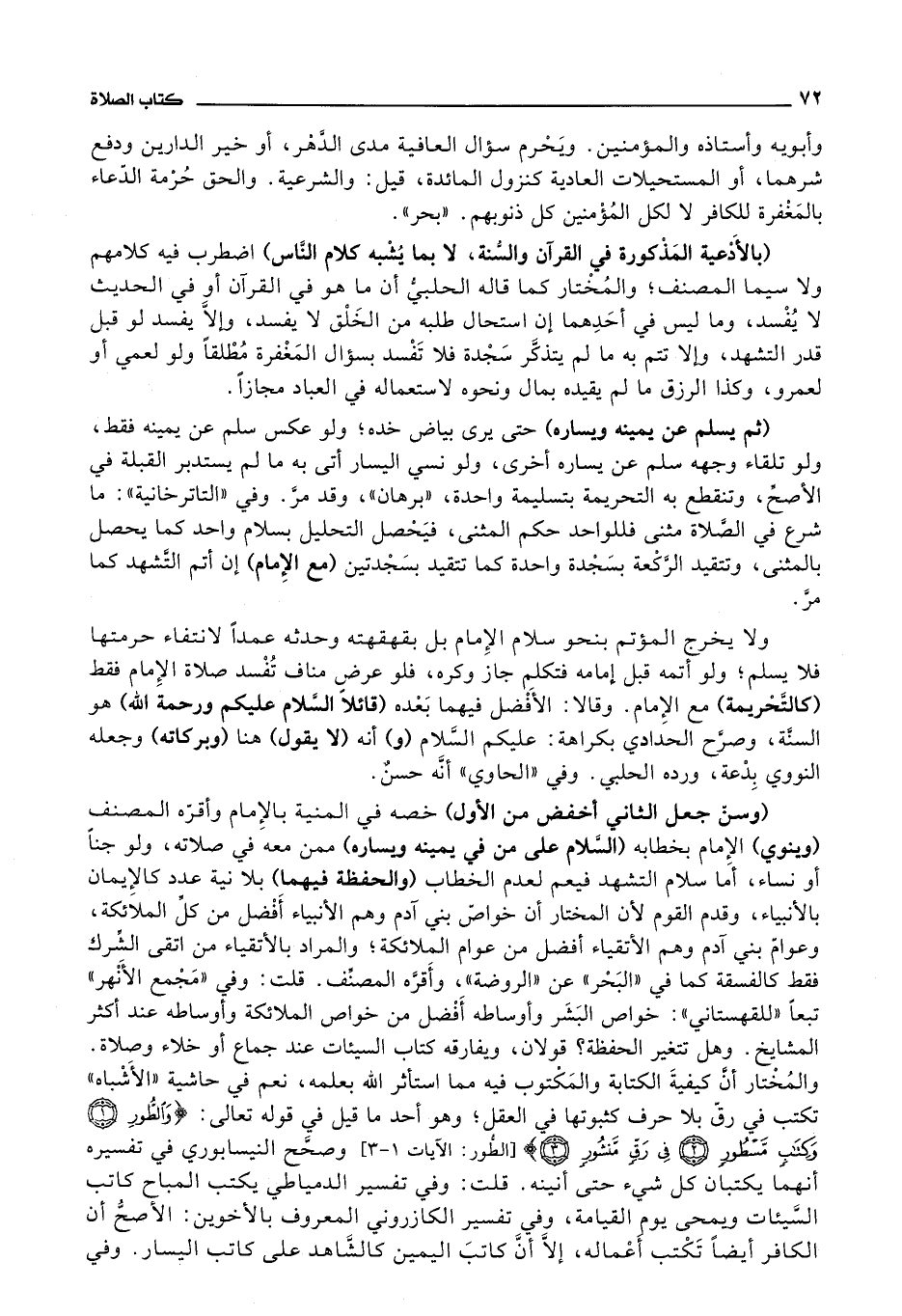 (وينوي) الامام بخطابه (السلام على من في يمينه ويساره) ممن معه في صلاته، ولو جنا أو نساء، أما سلام التشهد فيعم لعدم الخطاب (والحفظة فيهما) بلا نية عدد كالايمان بالانبياء، وقدم القوم لان المختار أن خواص بني آدم وهم الانبياء أفضل من كل الملائكة، عوام بني آدم وهم الاتقياء أفضل من عوام الملائكة، والمراد بالاتقياء من اتقى الشرك فقط كالفسقة كما