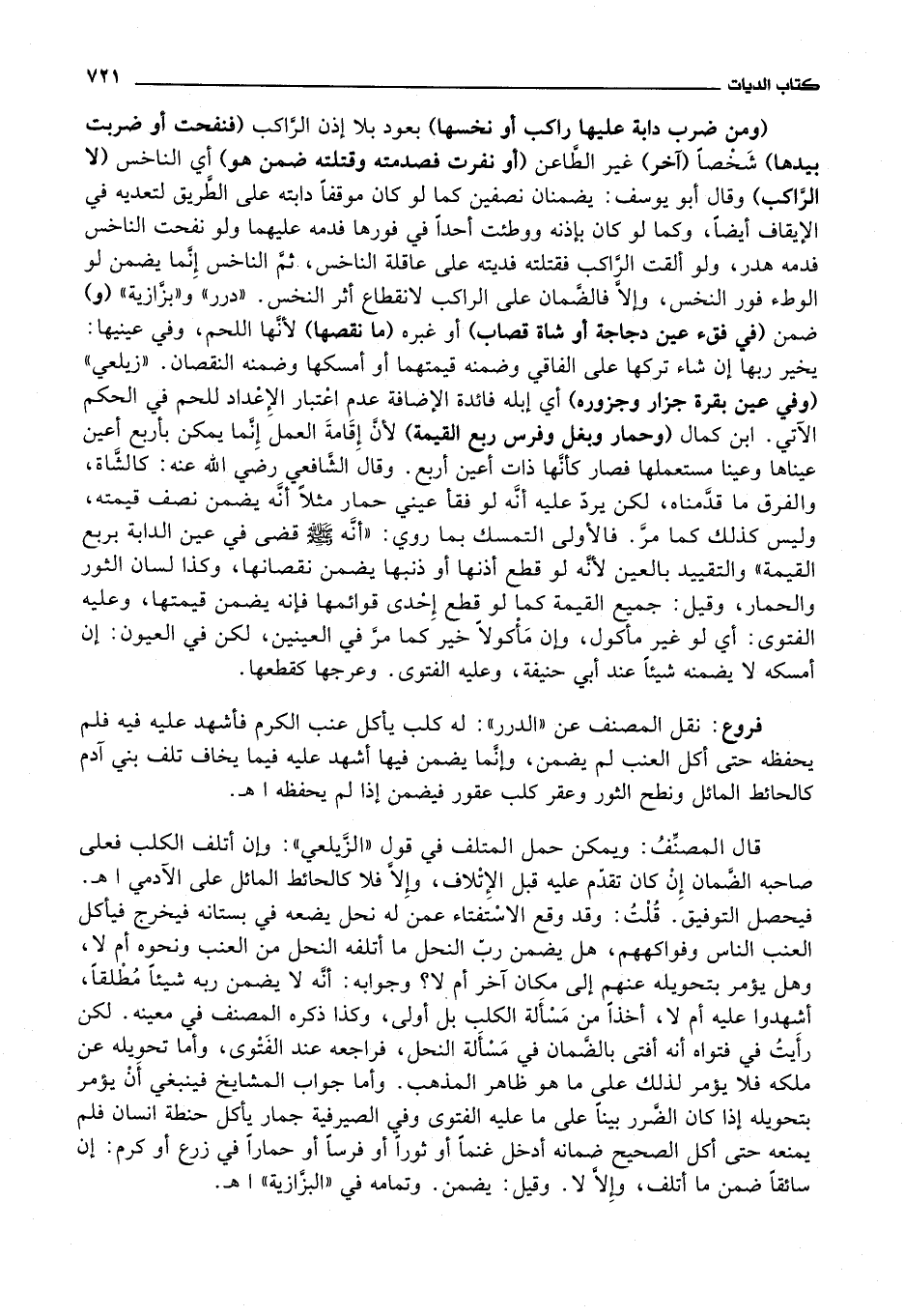 وفي الصيرفية جمار يأكل حنطة انسان فلم يمنعه حتى أكل الصحيح ضمانه أدخل غنما أو ثورا أو فرسا أو حمارا في زرع أو كرم: إن سائقا ضمن ما أتلف، وإلا لا.