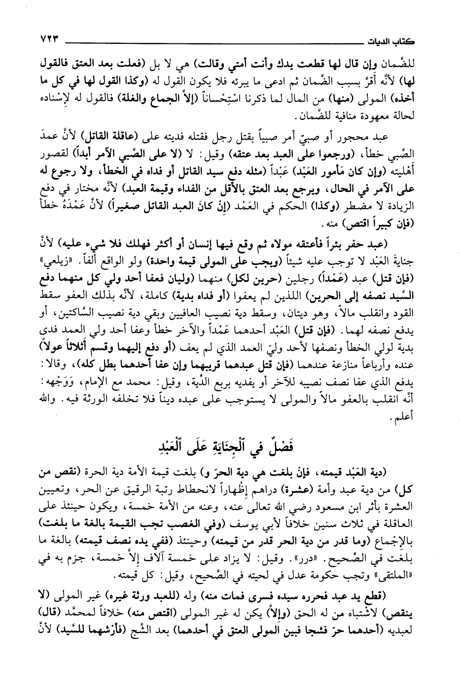 فصل في الجناية على العبد (دية العبد قيمته، فإن بلغت هي دية الحر و) بلغت قيمة الامة دية الحرة (نقص من كل) من دية عبد وأمة (عشرة) دراهم إظهارا لانحطاط رتبة الرقيق عن الحر، وتعيين العشرة بأثر ابن مسعود رضي الله تعالى عنه، وعنه من الامة خمسة، ويكون حينئذ على العاقلة في ثلاث سنين خلافا لابي يوسف (وفي الغصب تجب القيمة بالغة ما بلغت) بالاجماع (وما قدر من دية الحر قدر
