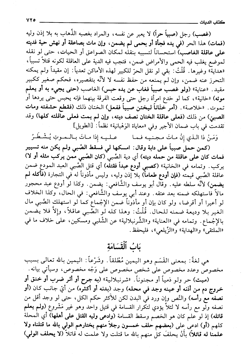 باب القسامة هي لغة: بمعنى القسم وهو اليمين مطلقا: وشرعا: اليمين بالله تعالى بسبب مخصوص وعدد مخصوص على شخص مخصوص على وجه مخصوص، وسيأتي بيانه (ميت) حر ولو ذميا أو مجنونا.