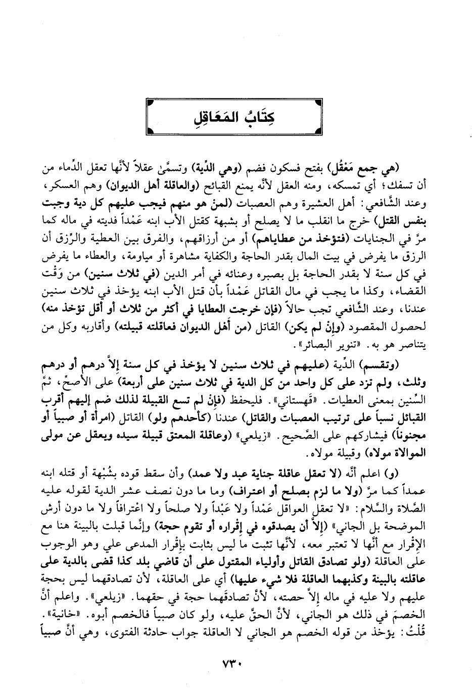(هي جمع معقل) بفتح فسكون فضم (وهي الدية) وتسمى عقلا لانها تعقل الدماء من أن تسفك: أي تمسكه، ومنه العقل لانه يمنع القبائح (والعاقلة أهل الديوان) وهم العسكر، وعند الشافعي: أهل العشيرة وهم العصبات (لمن هو منهم فيجب عليهم كل دية وجبت بنفس القتل)