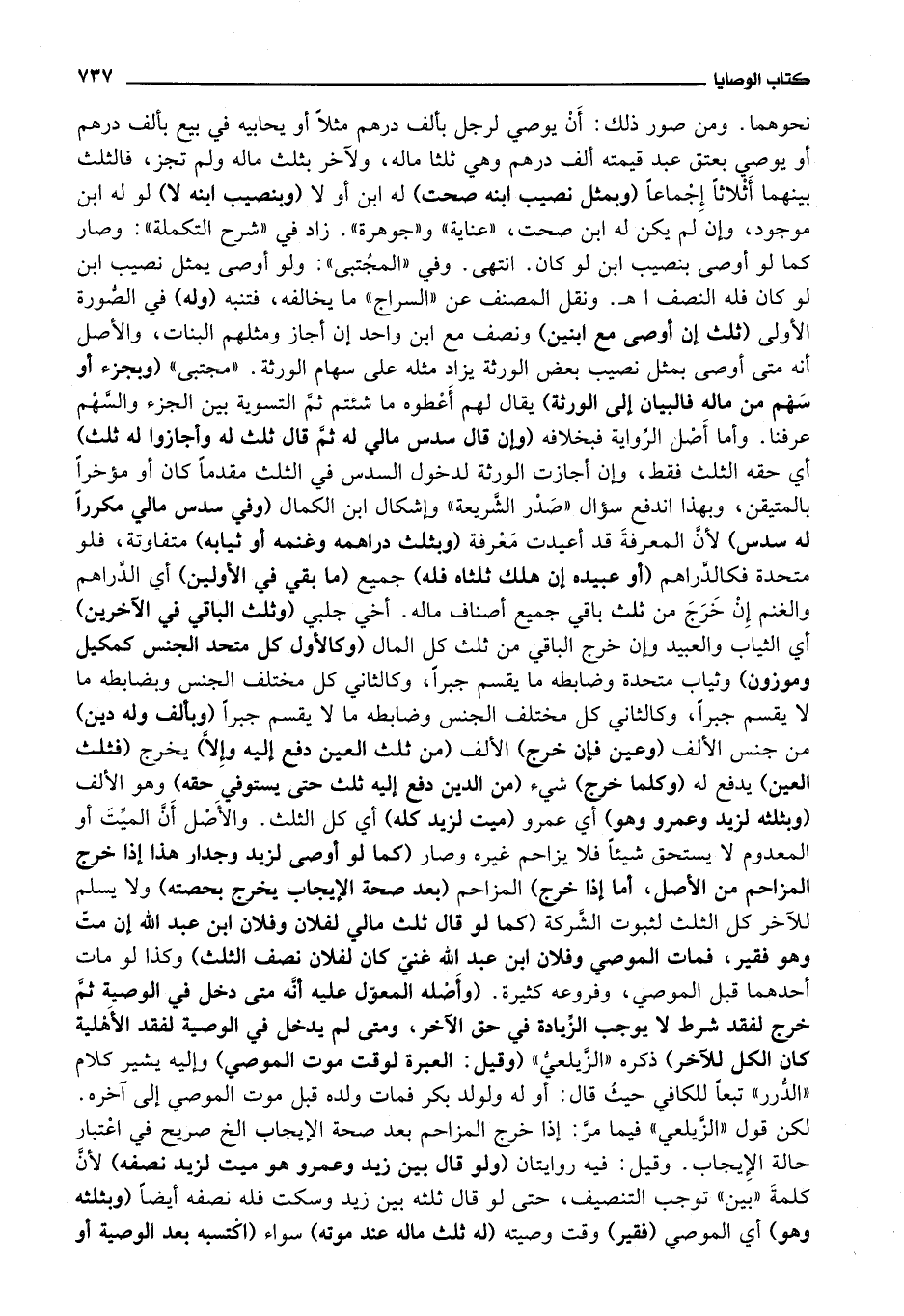 والاصل أن الميت أو المعدوم لا يستحق شيئا فلا يزاحم غيره وصار (كما لو أوصى لزيد وجدار هذا إذا خرج المزاحم من الاصل، أما إذا خرج) المزاحم (بعد صحة الايجاب يخرج بحصته) ولا يسلم للآخر كل الثلث لثوبت الشركة (كما لو قال ثلثمالي لفلان وفلان ابن عبد الله إن مت وهو فقير، فمات الموصي وفلان ابن عبد الله غني كان لفلان نصف الثلث) وكذا لو مات أحدهما قبل الموصي، وفروعه كثيرة.