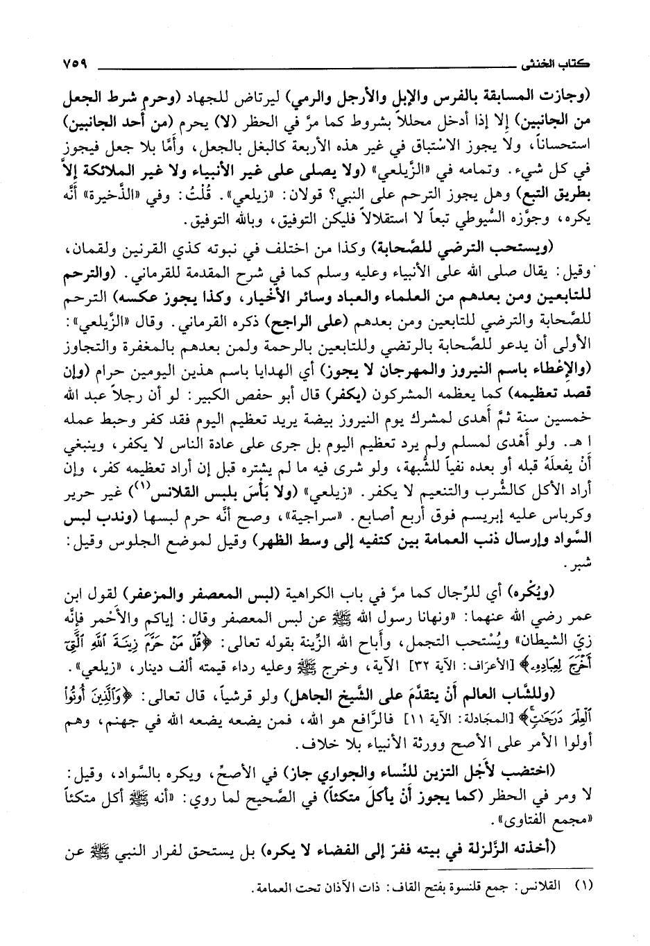 سراجية، وصح أنه حرم لبسها (وندب لبس السواد وإرسال ذنب العمامة بين كتفيه إلى وسط الظهر) وقيل لموضع الجلوس وقيل: شبر.