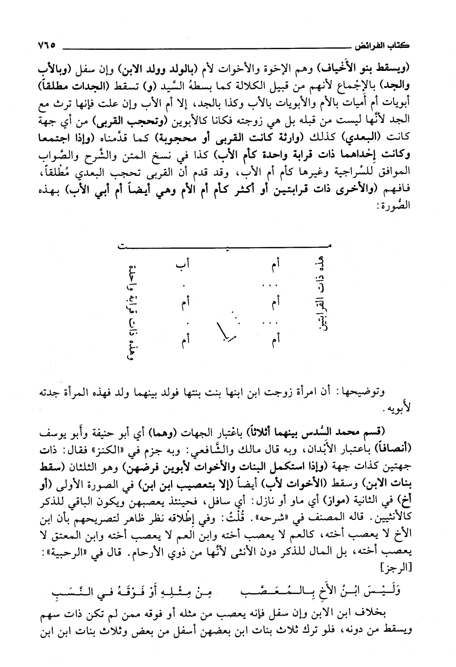 (و) تسقط (الجدات مطلقا) أبويات أم أميات بالام والابويات بالاب وكذا بالجد، إلا أم الاب وإن علت فإنها ترث مع الجد لانها ليست من قبله بل هي زوجته فكانا كالابوين (وتحجب القربى) من أي جهة كانت (البعدي) كذلك (وارثة كانت القربى أو محجوبة) كما قدمناه (وإذا اجتمعا وكانت إحداهما ذات قرابة واحدة كأم الاب) كذا في نسخ المتن والشرح والصواب الموافق للسراجية وغيرها كأم أم الاب، وقد قدم أن القربى تحجب البعدي مطلقا، فافهم (والاخرى ذات قرابتين أو أكثر كأم أم الام وهي أيضا أم أبي الاب) بهذه الصورة: ... وتوضيحها: أن امرأة زوجت ابن ابنها بنت بنتها فولد بينهما ولد فهذه المرأة جدته لابويه