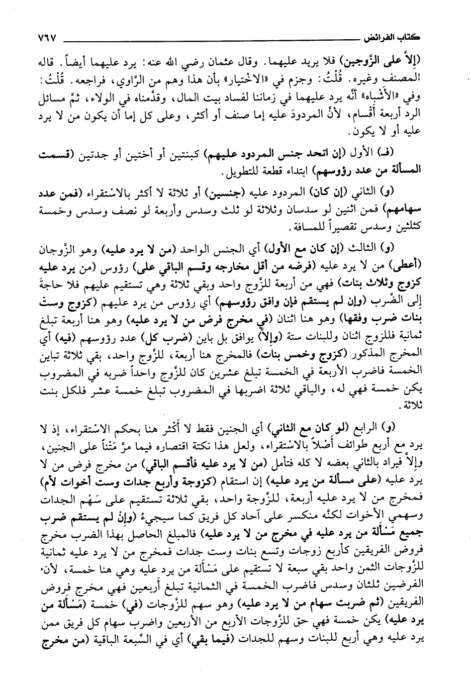 قلت: وفي الاشباه أنه يرد عليهما في زماننا لفساد بيت المال، وقدمناه في الولاء ثم مسائل الرد أربعة أقسام، لان المردود عليه إما صنف أو أكثر، وعلى كل إما أن يكون من لا يرد عليه أو لا يكون.