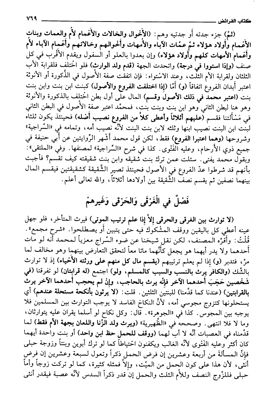 فصل في الغرقى والحرقى وغيرهم (لا توارث بين الغرقى والحرقى إلا إذا علم ترتيب الموتى) فيرث المتأخر، فلو جهل عينه أعطي كل باليقين ووقف المشكوك فيه حتى يتبين أو يصطلحوا.