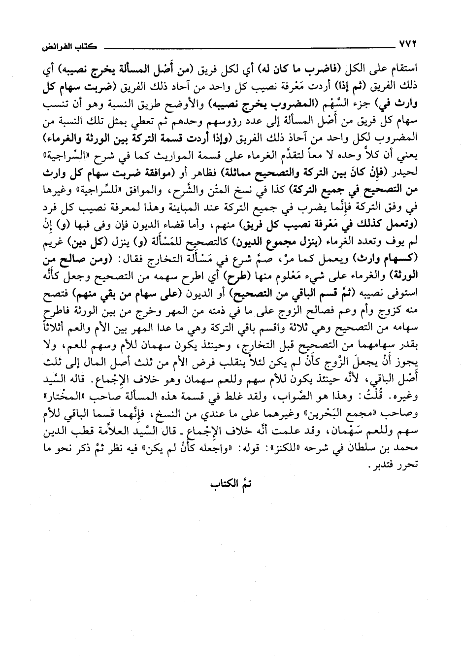 قلت: وهذا هو الصواب، ولقد غلطفي قسمة هذه المسألة صاحب المختار وصاحب مجمع البحرين وغيرهما على ما عندي من النسخ، فإنهما قسما الباقي للام سهم وللعم سهمان، وقد علمت أنه خلاف الاجماع - قال السيد العلامة قطب الدين محمد بن سلطان في شرحه للكنز: قوله: واجعله كأن لم يكن فيه نظر ثم ذكر نحو ما تحرر فتدبر.