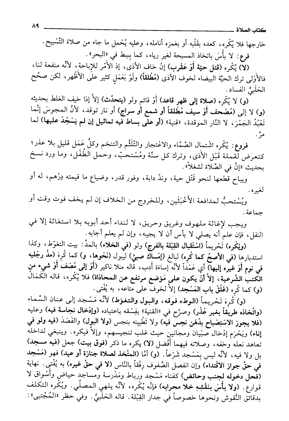 فروع يكره اشتمال الصماء والاعتجار والتلثم والتنخم وكل عمل قليل بلا عذر، كتعرض لقملة قبل الاذى، وترك كل سنة ومستحب،