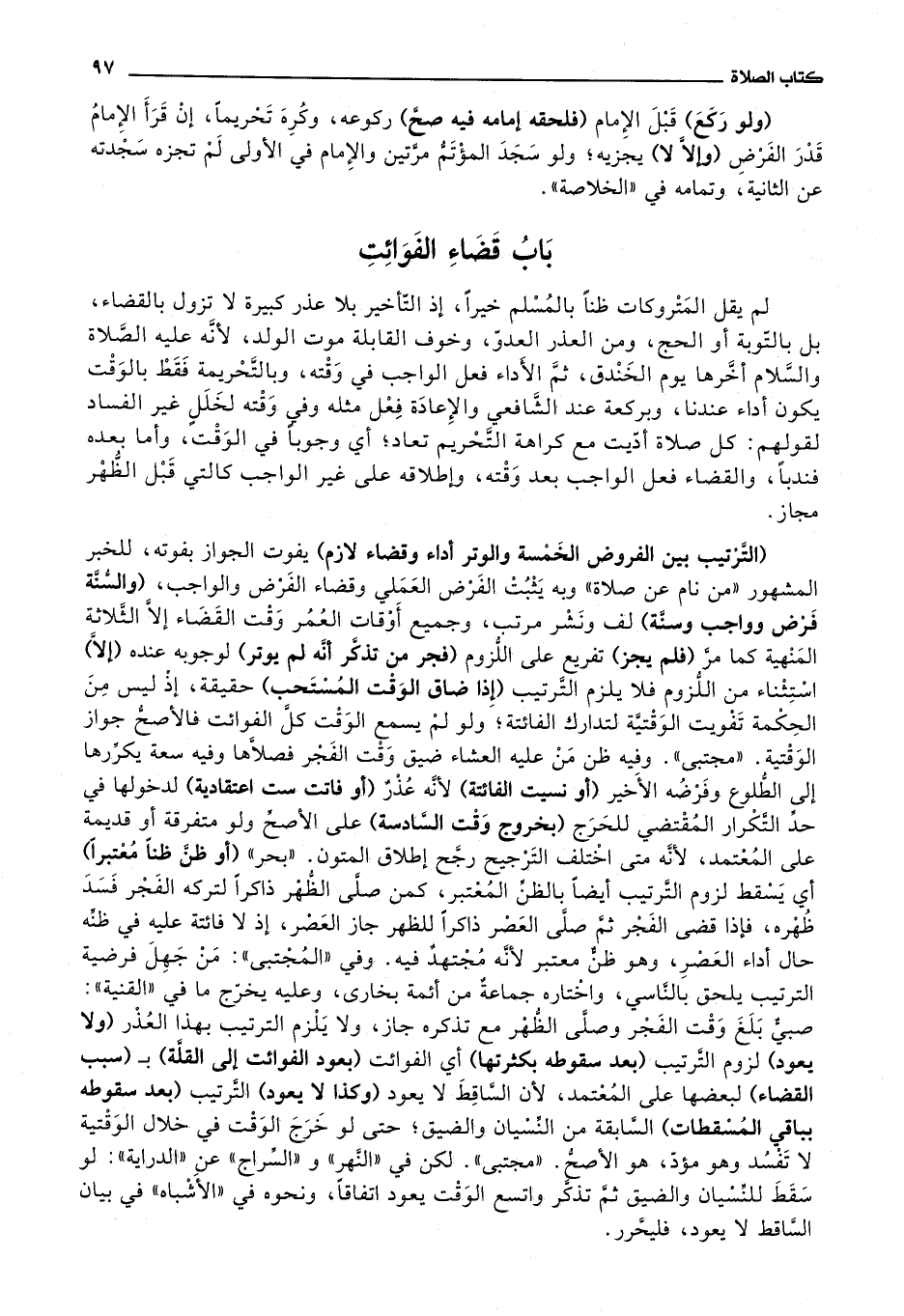 وفي المجتبى: من جهل فرضية الترتيب يلحق بالناسي، واختاره جماعة من أئمة بخارى، وعليه يخرج ما في القنية: صبي بلغ وقت الفجر وصلى الظهر مع تذكره جاز، ولا يلزم الترتيب بهذا العذر (ولا يعود) لزوم الترتيب (بعد سقوطه بكثرتها) أي الفوائت (بعود الفوائت إلى القلة) ب (سبب القضاء) لبعضها على المعتمد،