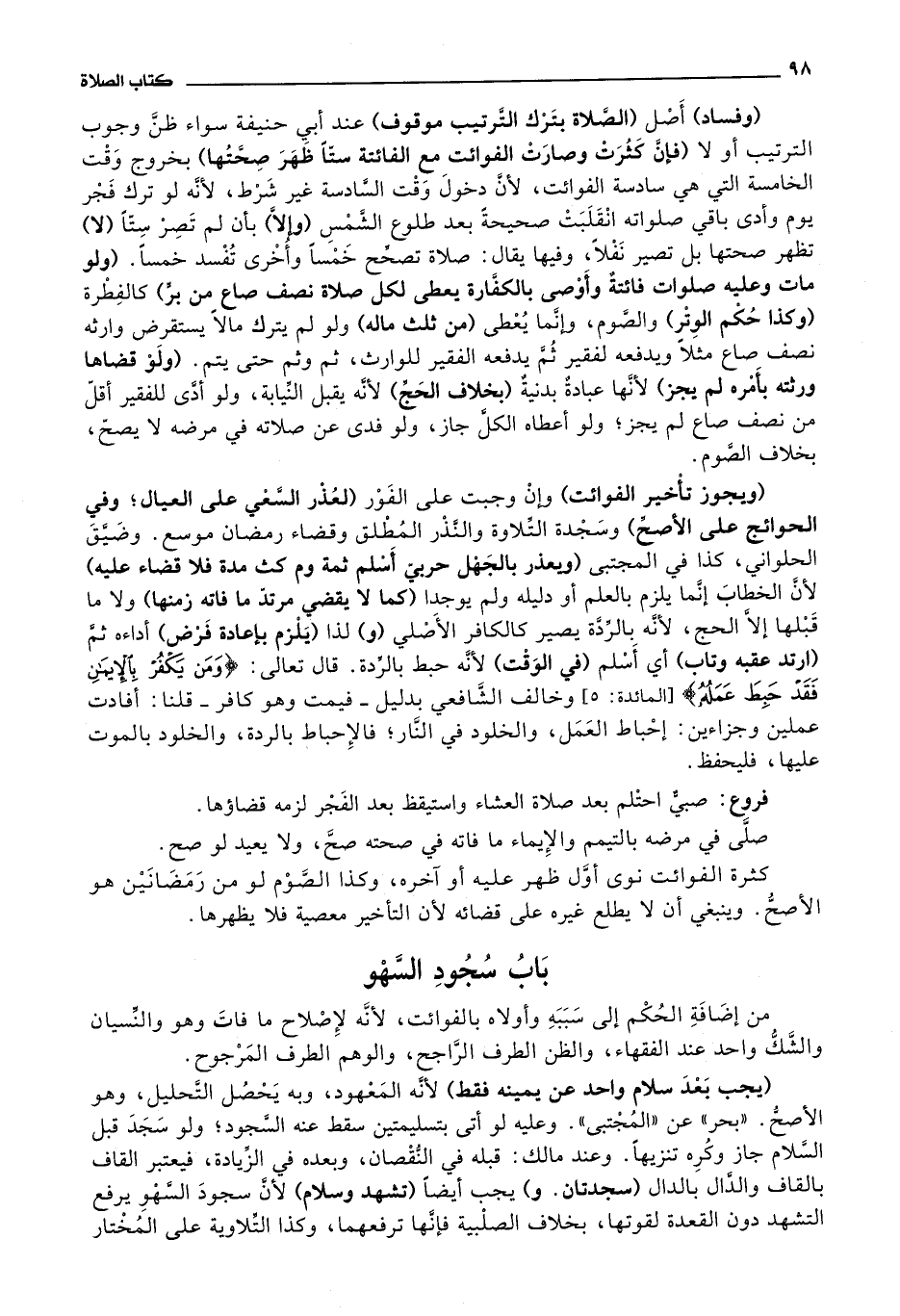 باب: سجود السهو من إضافة الحكم إلى سببه وأولاه بالفوائت، لانه لاصلاح ما فات وهو والنسيان والشك واحد عند الفقهاء، والظن الطرف الراجح، والوهم الطرف المرجوح