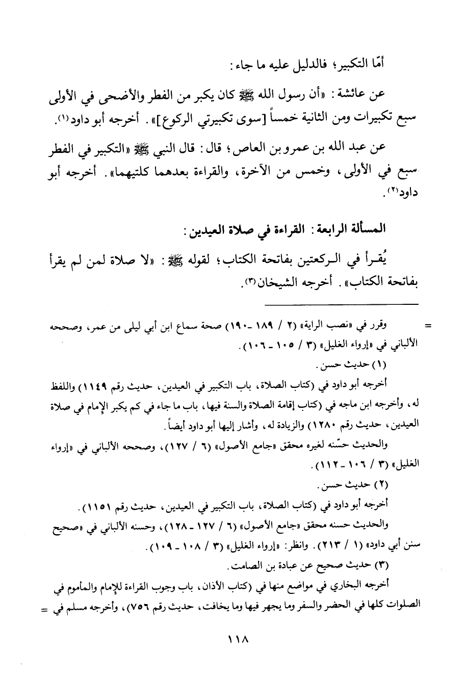 عن عبد الله بن عمرو بن العاص؛ قال: قال النبي صلى الله عليه وسلم " التكبير في الفطر سبع في الأولى، وخمس من الآخرة، والقراءة بعدهما كلتيهما". أخرجه أبو داود. (¬2)