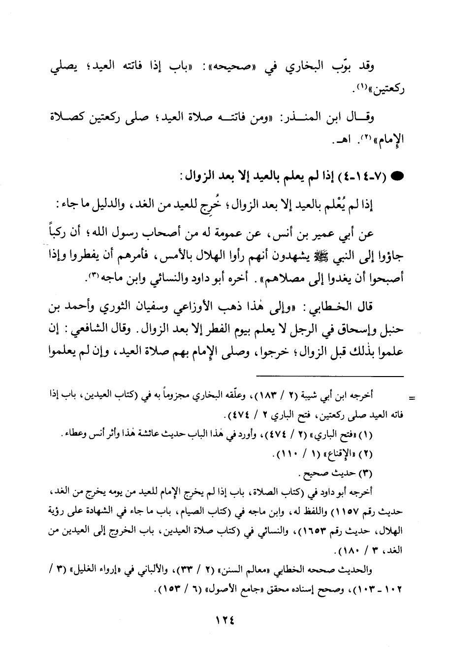 قال الخطابي: " وإلى هذا ذهب الأوزاعي وسفيان الثوري وأحمد بن حنبل وإسحاق في الرجل لا يعلم بيوم الفطر إلا بعد الزوال. وقال الشافعي: إن علموا بذلك قبل الزوال؛ خرجوا، وصلى الإمام بهم صلاة العيد، وإن لم يعلموا