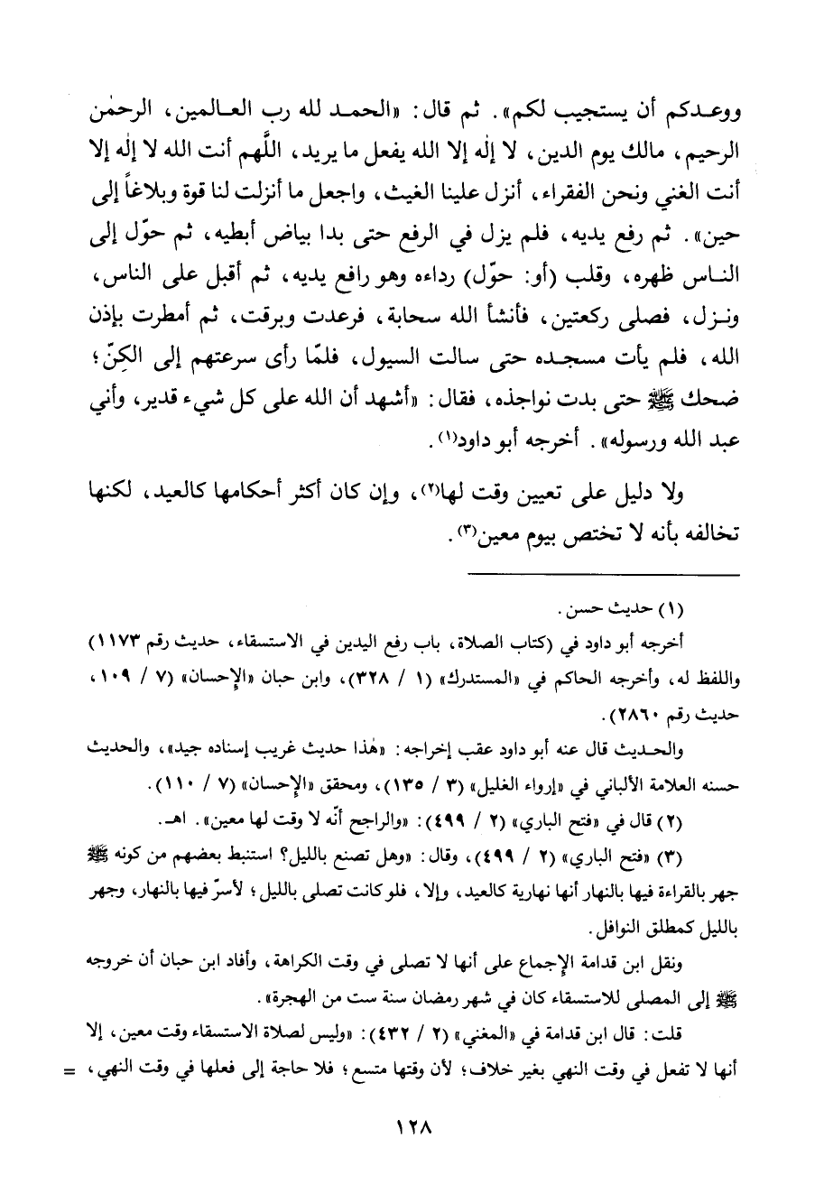 ونقل ابن قدامة الإجماع على أنها لا تصلى في وقت الكراهة، وأفاد ابن حبان أن خروجه صلى الله عليه وسلم إلى المصلى للاستسقاء كان في شهر رمضان سنة ست من الهجرة".