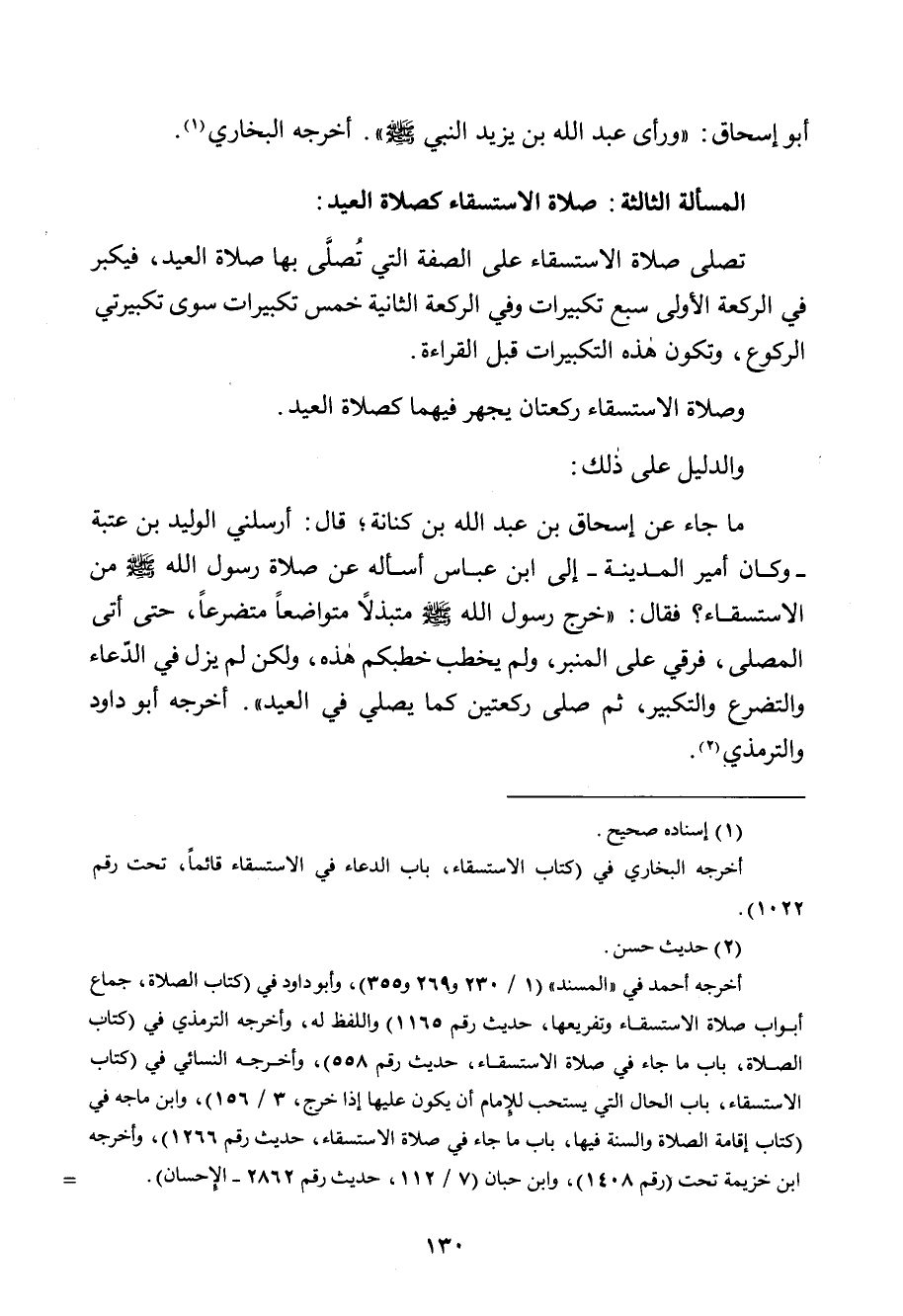 ما جاء عن إسحاق بن عبد الله بن كنانة؛ قال: أرسلني الوليد بن عتبة – وكان أمير المدينة – إلى ابن عباس أسأله عن صلاة رسول الله صلى الله عليه وسلم من الاستسقاء؟ فقال: " خرج رسول الله صلى الله عليه وسلم متبذلاً متواضعاً متضرعاً، حتى أتى المصلى، فرقى على المنبر، ولم يخطب خطبكم هذه، ولكن لم يزل في الدعاء والتضرع والتكبير، ثم صلى ركعتين كما يصلي في العيد". أخرجه أبو داود والترمذي. (¬2)