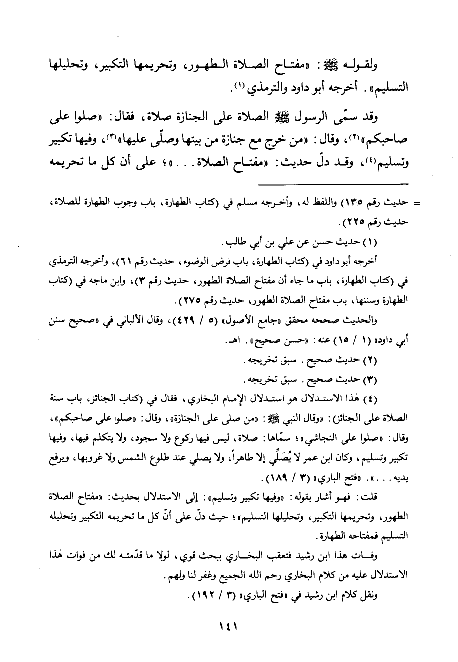 وقد سمى الرسول صلى الله عليه وسلم الصلاة على الجنازة صلاة، فقال: " صلوا على صاحبكم" (¬2) ، وقال: " من خرج مع جنازة من بيتها وصلى عليها" (¬3) ، وفيها تكبير وتسليم (¬4) ، وقد دل حديث: " مفتاح الصلاة ... "؛ على أن كل ما تحريمه
