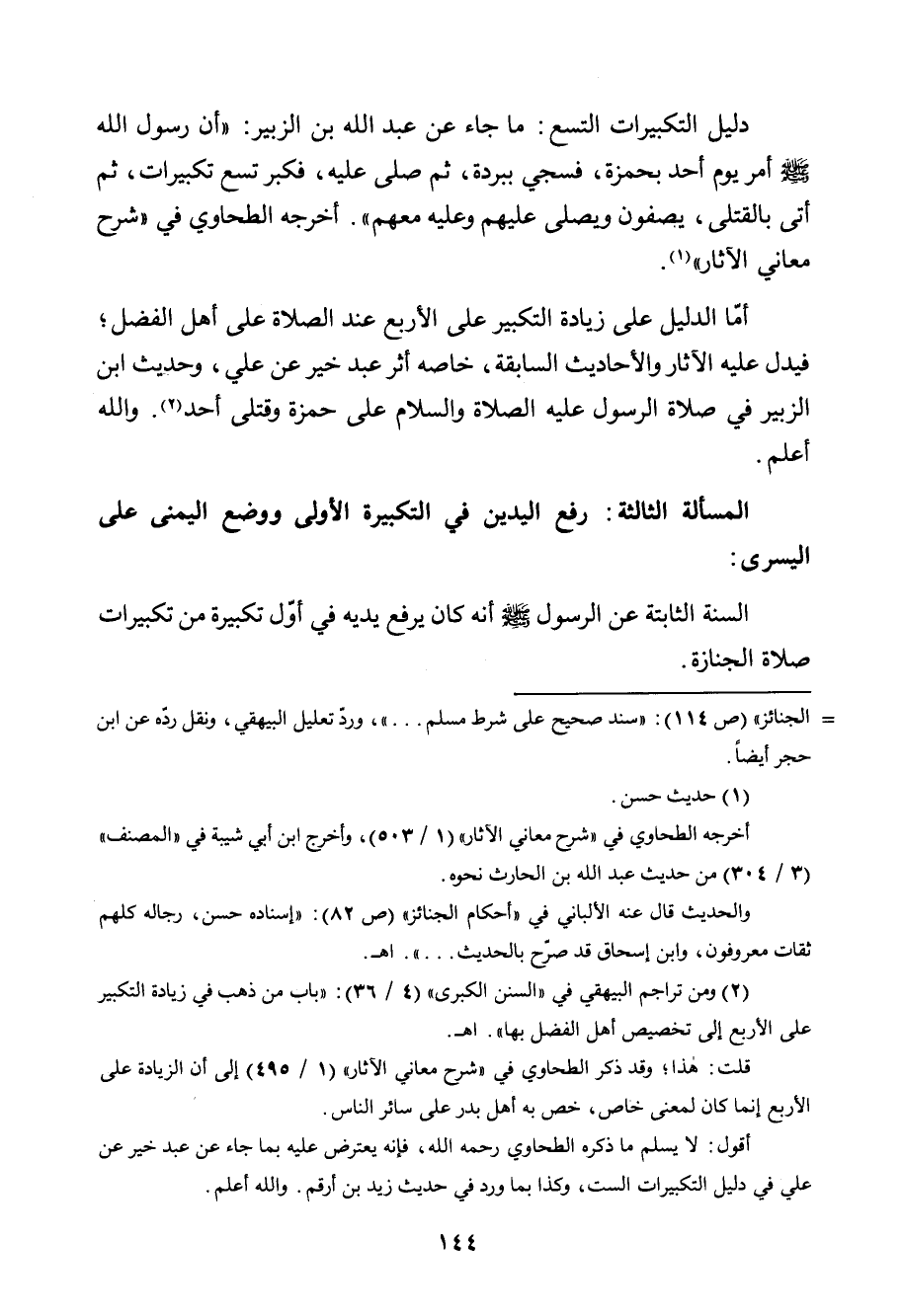 أما الدليل على زيادة التكبير على الأربع عند الصلاة على أهل الفضل؛ فيدل عليه الآثار والأحاديث السابقة، خاصة أثر عبد خير عن علي، وحديث ابن الزبير في صلاة الرسول عليه الصلاة والسلام على حمزة وقتلى أحد (¬2) . والله أعلم.