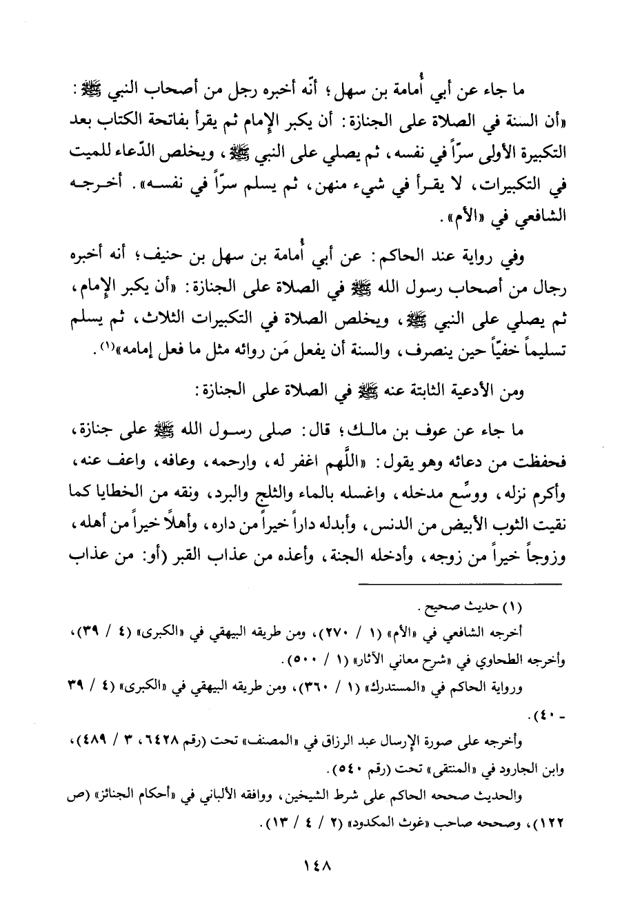 ما جاء عن أبي أمامة بن سهل؛ أنه أخبره رجل من أصحاب النبي صلى الله عليه وسلم: " أن السنة في الصلاة على الجنازة: أن يكبر الإمام ثم يقرأ بفاتحة الكتاب بعد التكبيرة الأولى سراً في نفسه، ثم يصلي على النبي صلى الله عليه وسلم، ويخلص الدعاء للميت في التكبيرات، لا يقرأ في شيء منهن، ثم يسلم سراً في نفسه". أخرجه الشافعي في " الأم".