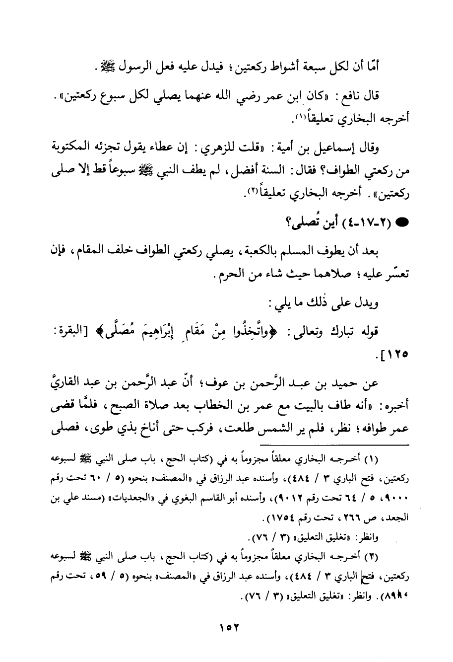 (¬2) أخرجه البخاري معلقاً مجزوماً به في (كتاب الحج، باب صلى النبي صلى الله عليه وسلم لسبوعه ركعتين، فتح الباري 3/484) ، وأسنده عبد الرزاق في "المصنف" بنحوه (5/59، تحت رقم 8990) . وانظر: "تغليق التعليق" (3/76) .