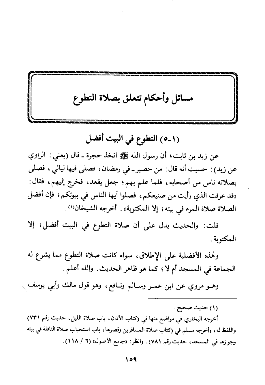 عن زيد بن ثابت؛ أن رسول الله صلى الله عليه وسلم اتخذ حجرة - قال (يعني: الراوي عن زيد) : حسبت أنه قال: من حصير - في رمضان، فصلى فيها ليالي، فصلى بصلاته ناس من أصحابه، فلما علم بهم؛ جعل يقعد، فخرج إليهم، فقال: " قد عرفت الذي رأيت من صنيعكم، فصلوا أيها الناس في بيوتكم؛ فإن أفضل الصلاة صلاة المرء في بيته؛ إلا المكتوبة". أخرجه الشيخان. (¬1)