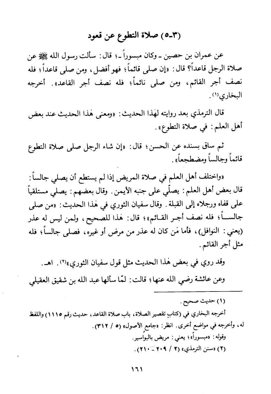 عن عمران بن حصين - وكان مبسوراً -؛ قال: سألت رسول الله صلى الله عليه وسلم عن صلاة الرجل قاعداً؟ قال: " إن صلى قائماً؛ فهو أفضل، ومن صلى قاعداً؛ فله نصف أجر القائم، ومن صلى نائماً، فله نصف أجر القاعد". أخرجه البخاري. (¬1)