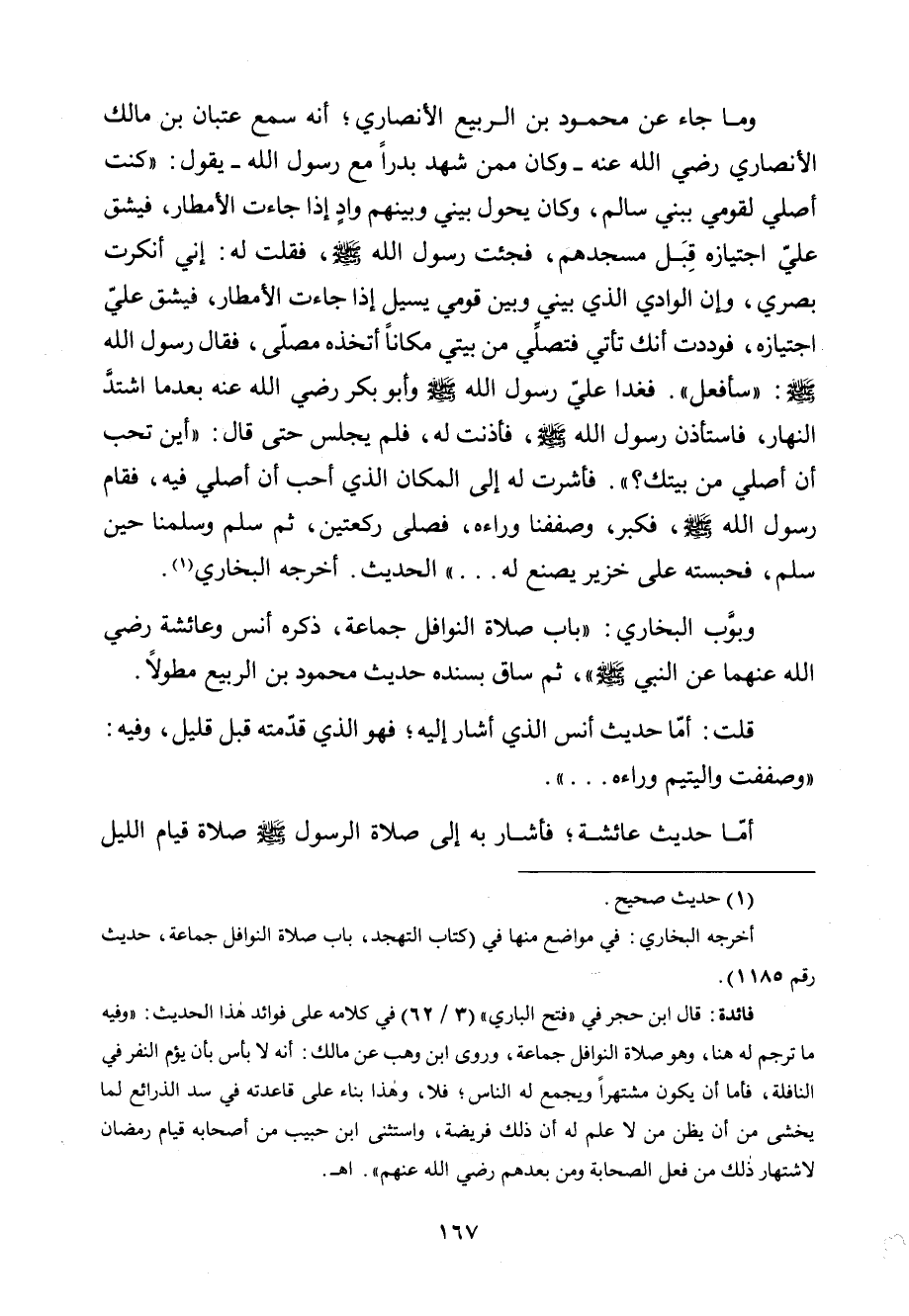 فائدة: قال ابن حجر في "فتح الباري" (3/62) في كلامه على فوائد هذا الحديث: " وفيه ما ترجم له هنا، وهو صلاة النوافل جماعة، وروى ابن وهب عن مالك: أنه لا بأس بأن يؤم النفر في النافلة، فأما أن يكون مشتهراً ويجمع له الناس؛ فلا، وهذا بناء على قاعدته في سد الذرائع لما يخشى من أن يظن من لا علم له أن ذلك فريضة، واستثنى ابن حبيب من أصحابه قيام رمضان لاشتهار ذلك من فعل الصحابة ومن بعدهم رضي الله عنهم". اهـ.