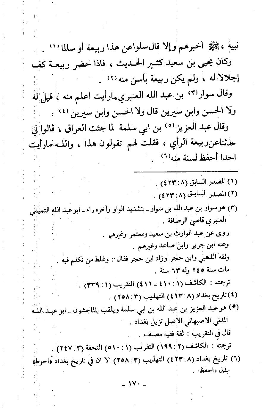 نبيه صلى الله عليه وسلم أخبرهم وإلا قال سلوا عن هذا ربيعة أو سالما وكان يحيى بن سعيد كثير الحديث فإذا حضر ربيعة كف إجلالا له ولم يكن ربيعة بأسن منه وقال سوار بن عبد الله العنبري ما رأيت أعلم منه قيل له ولا الحسن وابن سيرين قال ولا الحسن وابن سيرين وقال عبد العزيز بن أبي سلمة لما جئت العراق قالوا لي حدثنا عن ربيعة الرأي فقلت لهم تقولون هذا والله ما رأيت أحدا أحفظ لسنة منه