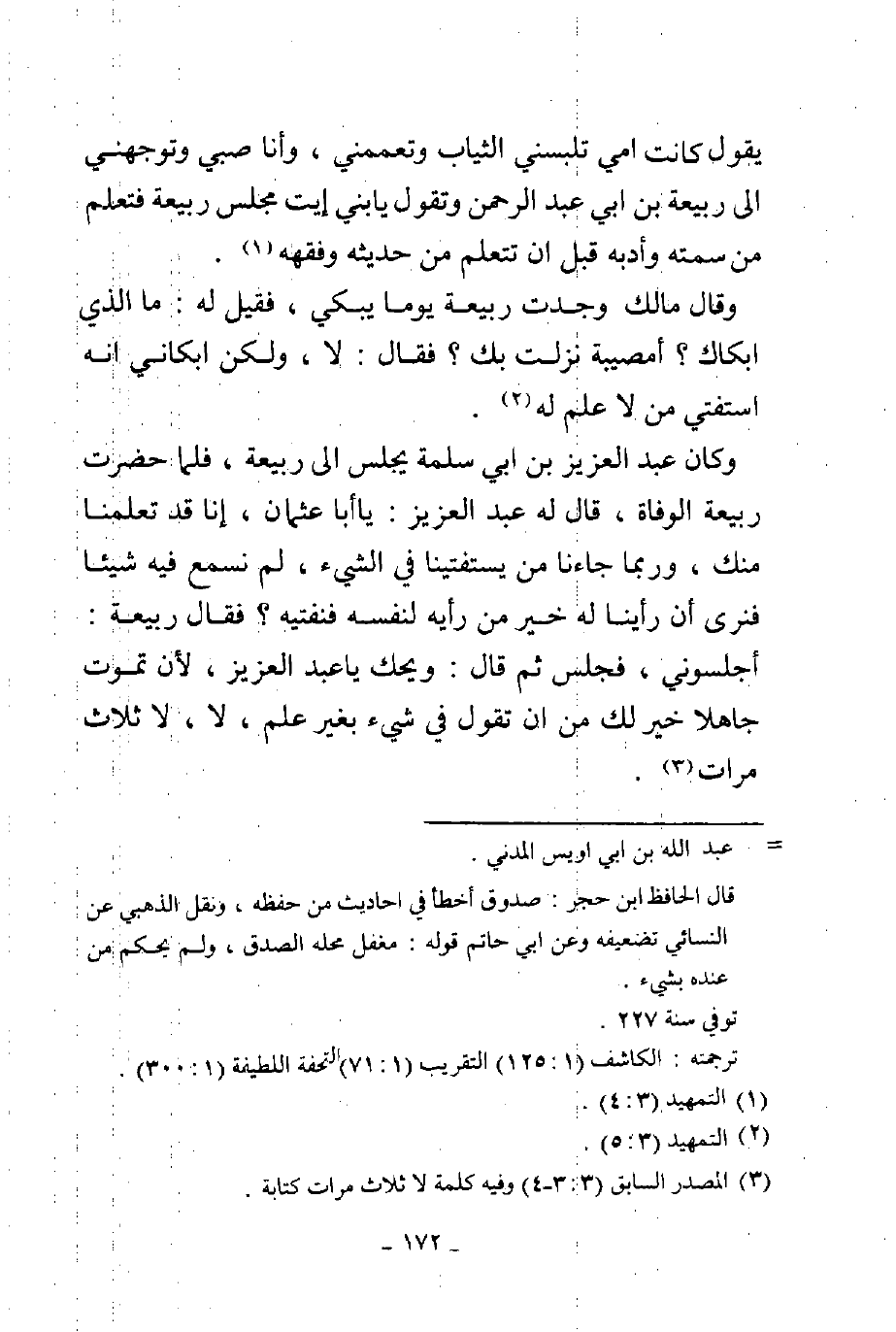 يقول كانت أمى تلبسني الثياب وتعممنى وأنا صبي وتوجهنى ألى ربيعة بن أبي عبد الرحمن وتقول يا بنى إيت مجلس ربيعة فتعلم من سمته وأدبه قبل أن تتعلم من حديثه وفقهه وقال مالك وحدث ربيعة يوما يبكى فقيل له ما الذي أباكاك أمصيبة نزلت بك فقال لا ولكن أبكاني أنه استفتى من لا علم له وكان عبد العزيز بن أبي سلمة يجلس إلى ربيعة فلما حضرت ربيعة الوفاة قال له عبد العزيز يا أبا عثمان إنا قد تعلمنا منك وربما جاءنا من يستفتينا في الشيء لم نسمع فيه شيئا فنرى أن رأينا له خير من رأيه لنفسه فنفيته فقال ربيعة أجلسوني فجلس ثم قال ويحك يا عبد العزيز لأن تموت جاهلا خير لك من أن تقول في شيء بغير علم لا لا ثلاث مرات