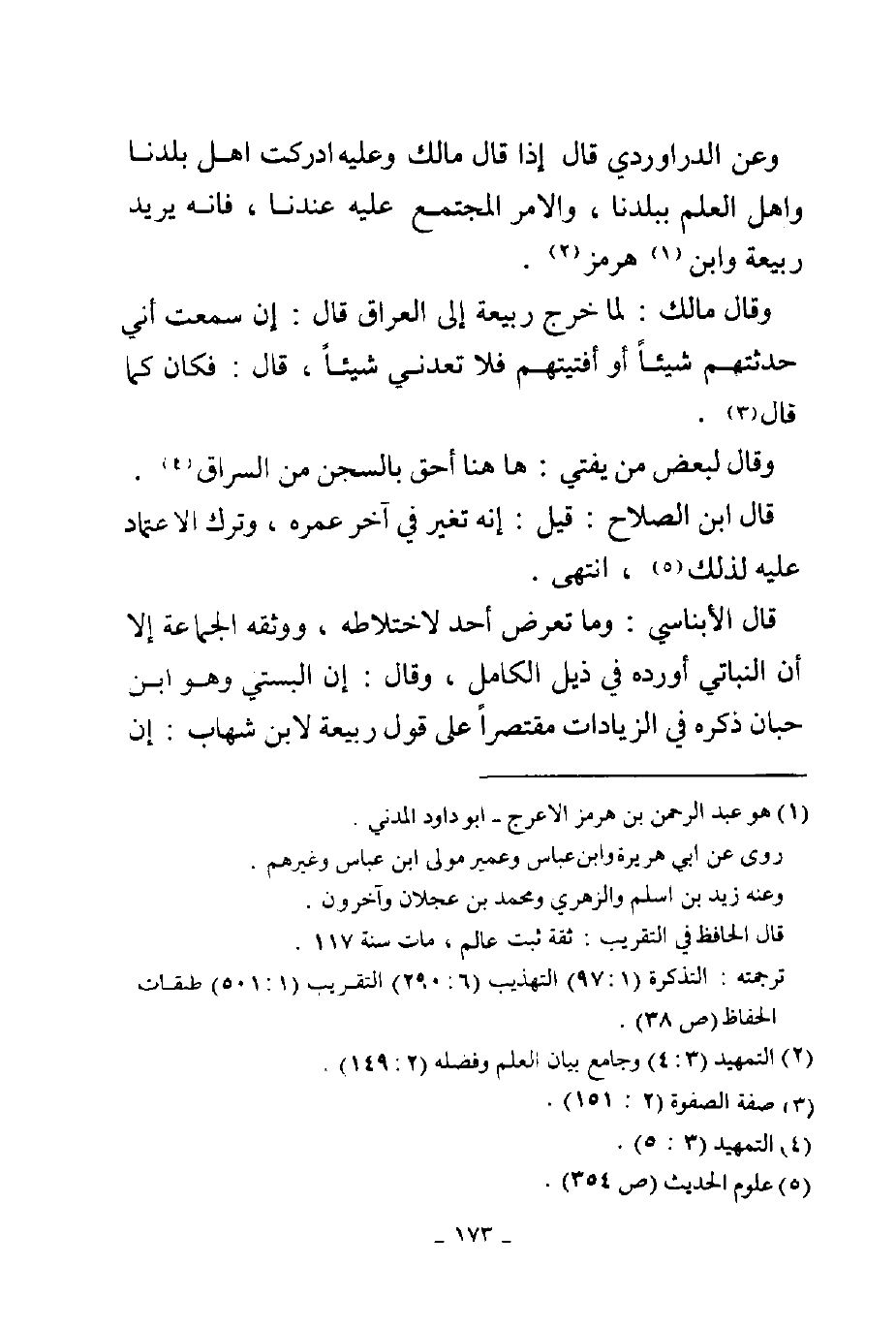 وعن الدراوردي قال إذا قال مالك وعليه أدركت أهل بلدنا وأهل العلم ببلدنا والأمر المجتمع عليه عندنا فإنه يريد ربيعة وابن هرمز وقال مالك لما خرج ربيعة إلى العراق قال لي إن سمعت أنى حدثتهم شيئا أو أفتيتهم فلا تعدني شيئا قال فكان كما قال وقال لبعض من يفتى ههنا أحق بالسجن من السراق قال بن الصلاح قيل أنه تغير في آخر عمره وترك الاعتماد عليه لذلك انتهى قال الأبناسي وما تعرض أحد لاختلاطه ووثقه الجماعة إلا أن النباتي أورده في ذيل الكامل وقال إن البستي وهو بن حبان ذكر في الزيادات متقصرا على قول ربيعة لابن شهاب إن