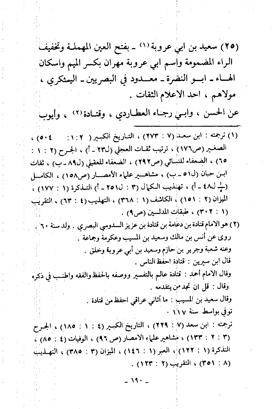 25 - سعيد بن أبي عروبة بفتح العين المهملة وتخفيف الراء المضمومة واسم أبى عروبة مهران بكسر الميم وإسكان الهاء أبو النضر معدود في البصريين اليشكري مولاهم