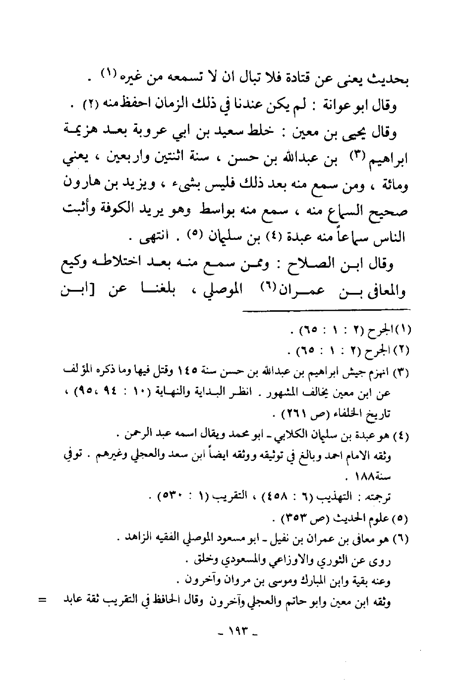 بحديث يعنى عن قتادة فلا تبالي أن لا تسمعه من غيره وقال أبو عوانة لم يكن عندنا في ذلك الزمان أحفظ منه قال يحيى بن معين خلط سعيد بن أبي عروبة بعد هزيمة إبراهيم بن عبد الله بن حسن سنة ثنتين وأربعين يعنى ومئة ومن سمع منه بعد ذلك فليس بشيء ويزيد بن هارون صحيح السماع منه سمع منه بواسط وهو يريد الكوفة وأثبت الناس سماعا منه عبدة بن سليمان انتهى وقال بن الصلاح وممن عرف أنه سمع بعد اختلاطه وكيع والمعافى بن عمران الموصلي بلغنا عن بن
