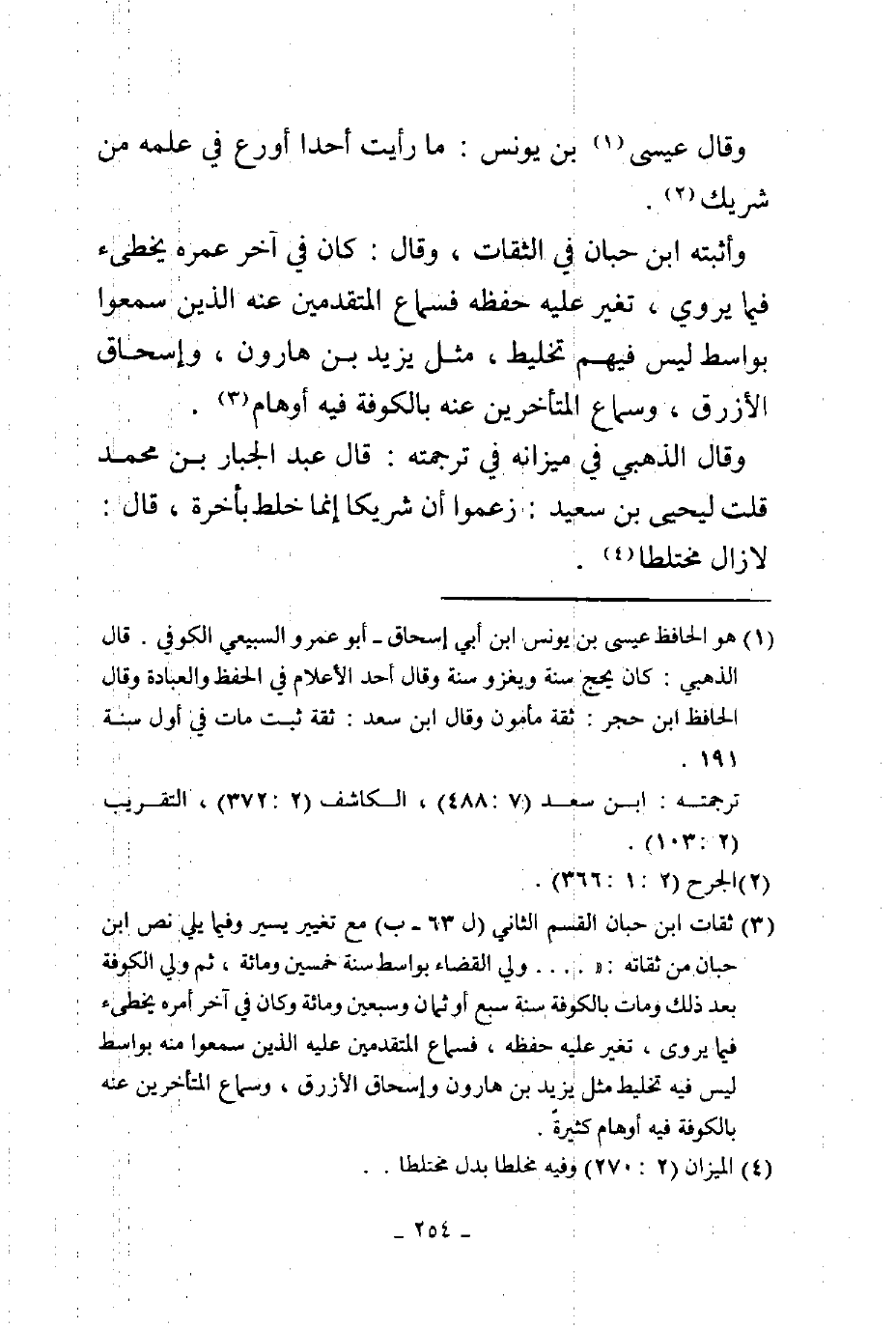 وقال عيسى بن يونس ما رأيت أحدا أورع في علمه من شريك وأثبته بن حبان في الثقات وقال كان في آخر عمره يخطىء فيما يروي تغير عليه حفظه فسماع المتقديمن عنه الذين سمعوا بواسط ليس فيهم تخليط مثل يزيد بن هارون وإسحاق الأزرق وسماع المتأخرين عنه بالكوفة فيه أوهام وقال الذهبي في ميزانه في ترجمته قال عبد الجبار بن محمد قلت ليحيى بن سعيد زعموا أن شريكا إنما خلط بأخرة قال ما زال مختلطا