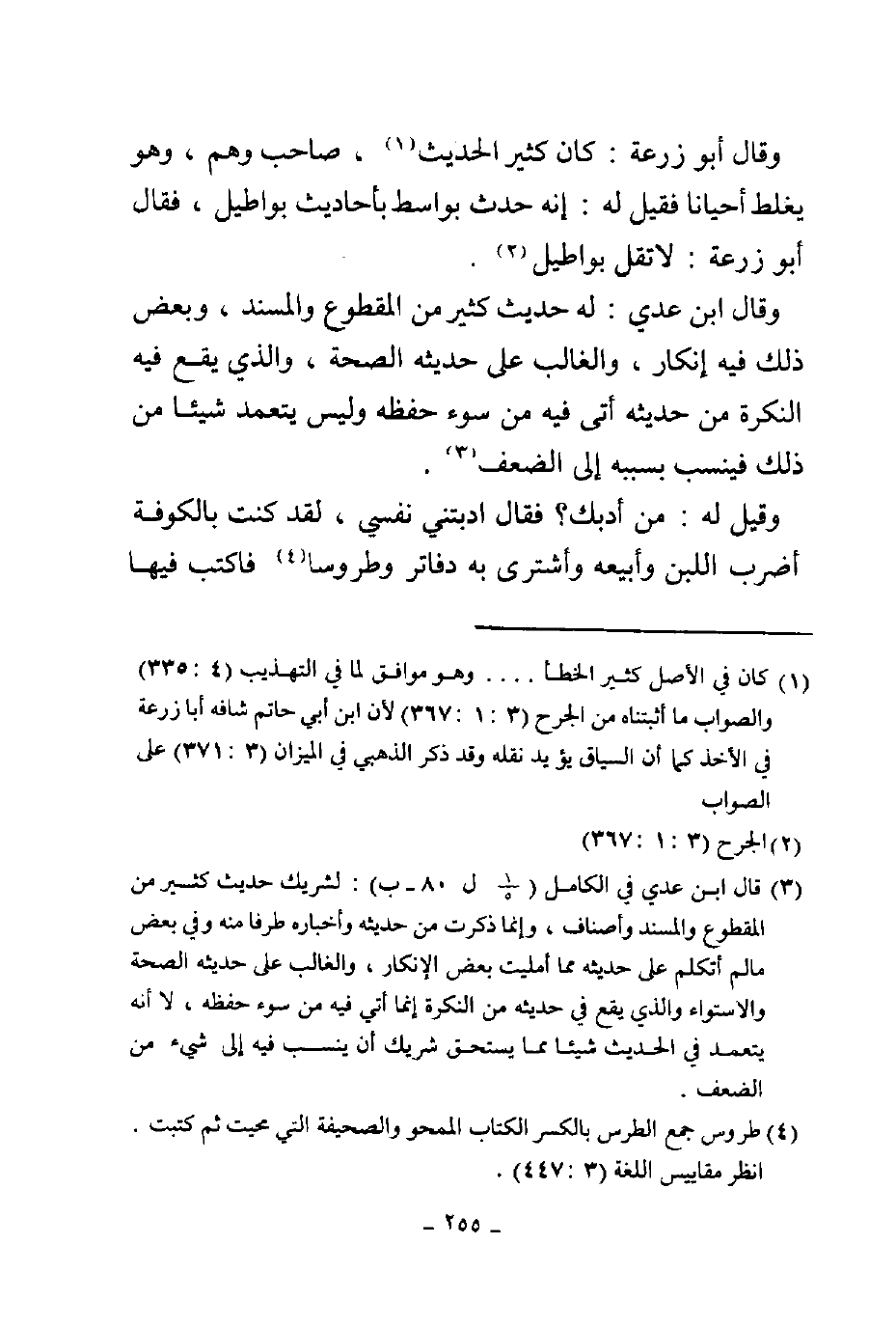 وقال أبو زرعة كان كثير الخطأ صاحب وهم وهو يغلط أحيانا فقيل له إنه حدث بواسطة بأحاديث بواطيل فقال أبو زرعة لا تقل بواطيل وقال بن عدي له حديث كثير من المقطوع والمسند وبعض ذلك فيه إنكار والغالب على حديثه الصحة والذي يقع فيه النكرة من حديثه أوتي فيه من سوء حفظه وليس يتعمد شيئا من ذلك فينسب بسببه إلى الضعف وقيل له من أدبك فقال أدبتني نفسي لقد كنت بالكوفة أضرب اللبن وأبيعه وأشتري به دفاتر وطروسا فأكتب فيها
